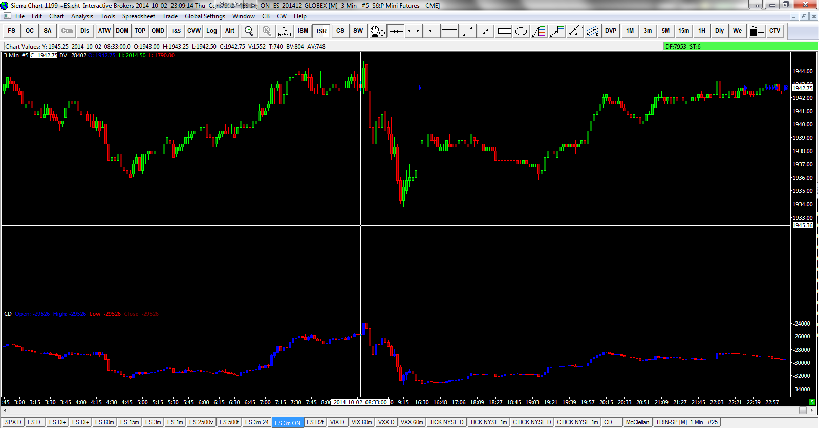 Instrument: ESZ14 Chart type: 3 minute bars Session: starts 163000 ends 092959 Study: CD Volume Bars Issue: have study setup to Reset at start of trading day, but it does not reset Example: refer to attached chart. CD starts at ~-33,000 Please tell me how can I fix this problem? |