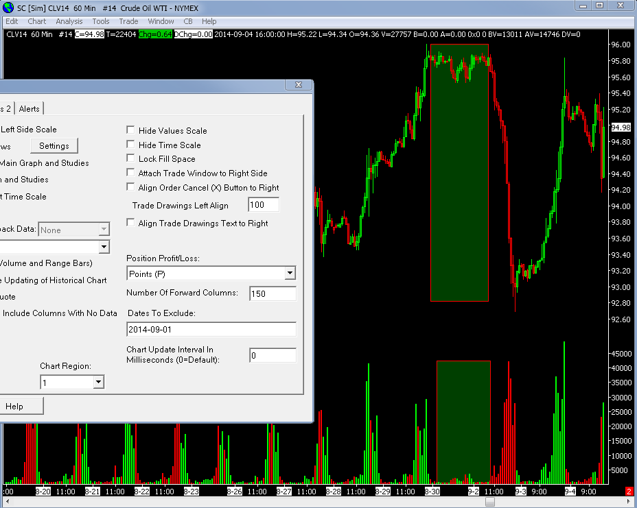 "This way you can tell just by looking at the top line of the chart where you see [C]" Subtle but better than not knowing :-) Will this cope with what I showed above, that SC can, at times, "not" do a volume rollover and fall back to date rollover even with no error reported? Two related questions that arose while testing the rollover issue: 1. When I open a continuous chart like CL#, where does it come from? SC server? Rithmic? Optimus backfill? 2. I tried to exclude a date from a chart (see attached picture) but it doesn't seem to work. never tried this before Date Time Of Last Edit: 2014-10-06 11:16:22