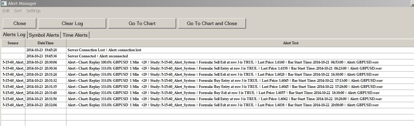 Update: the only time I get the audible alerts and the alert manager log entries is when I replay one of the charts on standard - and this just started happening. But still nothing except the drawings during live. Attached is a snap of the alert manager with the replay alerts logged.