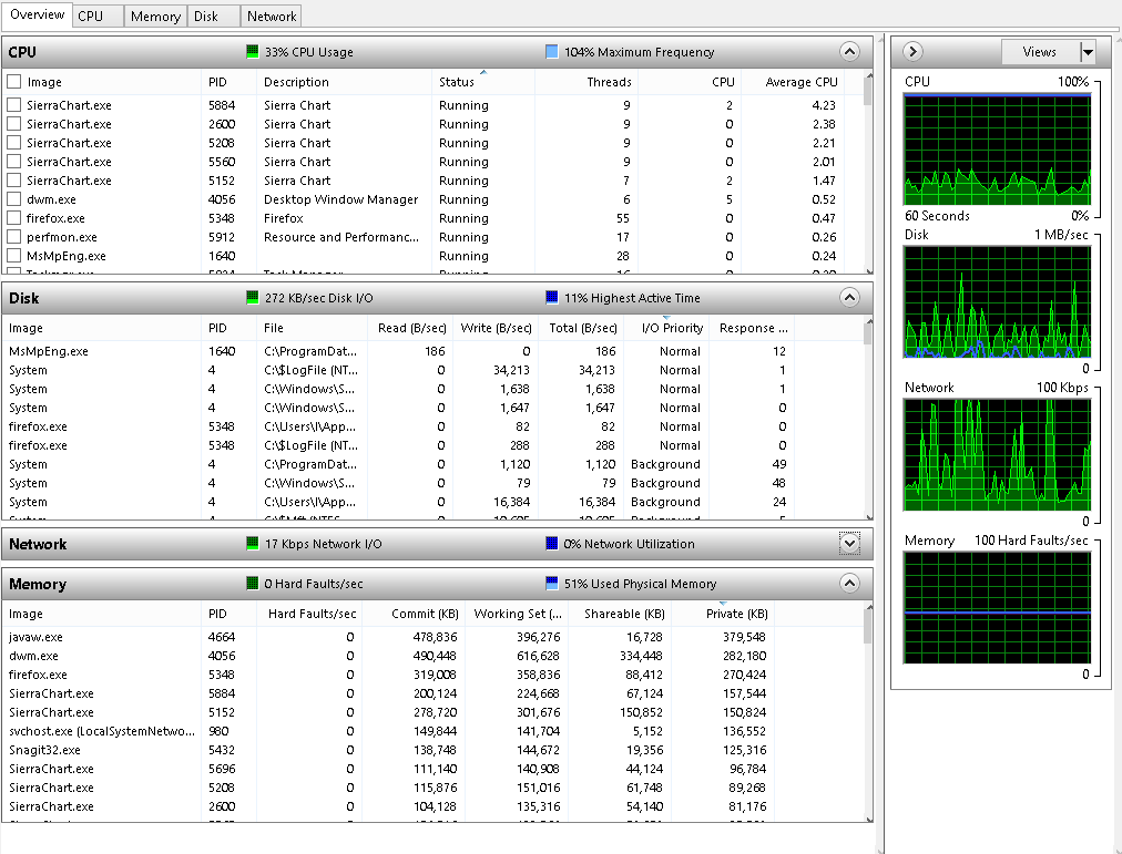 I have made some adjustment, the memory usage is down to 50%. I look at the cpu usage more carefully, it's moving between 20% to 50%. I don't have ssd. The hdd usage is between 0% to 20%. (please see images in attachment for detail) I have 6 copies of sierrachart opened. 2 of them are very responsive and fast. However, the other 4 copies, that have more days of data and studies to process are less responsive, price bars update slower than they should. Please tell me what hardware should I upgrade in order to make all copies of sierrachart to run as fast as they could. |