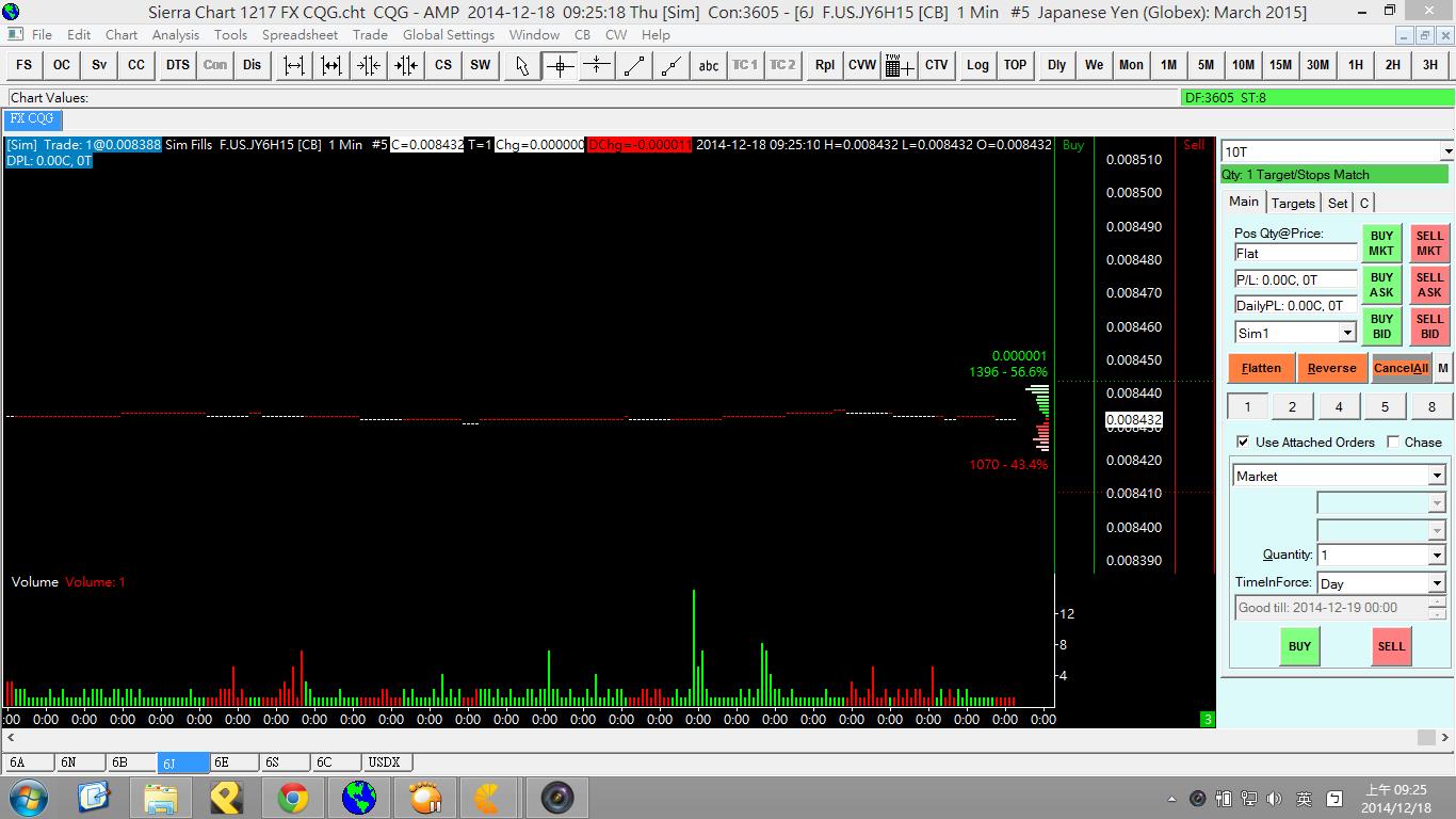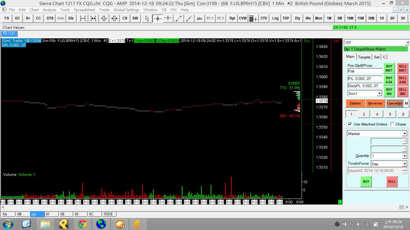 Hi Support! Software version: 1217 data feed: AMP CQG Only tick charts available even change to 1 minute or 1 Hour bar periods the problem only on symbol: J6(JPY), B6(GBP), S6(SF), and US dollars index. (other FX futures are fine) pls refer to attached , thanks. Date Time Of Last Edit: 2014-12-18 02:18:17