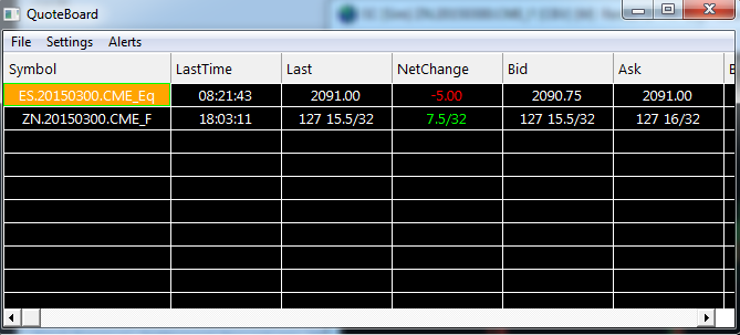 Please see attached screenshot taken at 08:21 CST. The quote board contains the ES and ZN. As you can see the ES is fine. Last trade time is 08:21. Something is wrong with the ZN. Last trade time is 18:03 Thanks. |