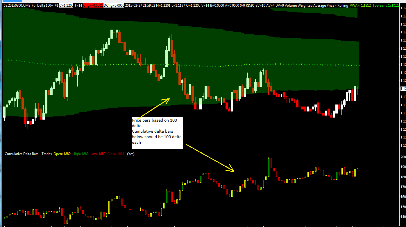 Hello, I have a 100 delta main chart. I then added a cumulative delta study below it. I expected all the delta bars inn the study to be the same size i.e 100 delta blocks but they are not. I have this chart set up in Market Delta and all the blocks are the same size. Can you tell me what is wrong? |