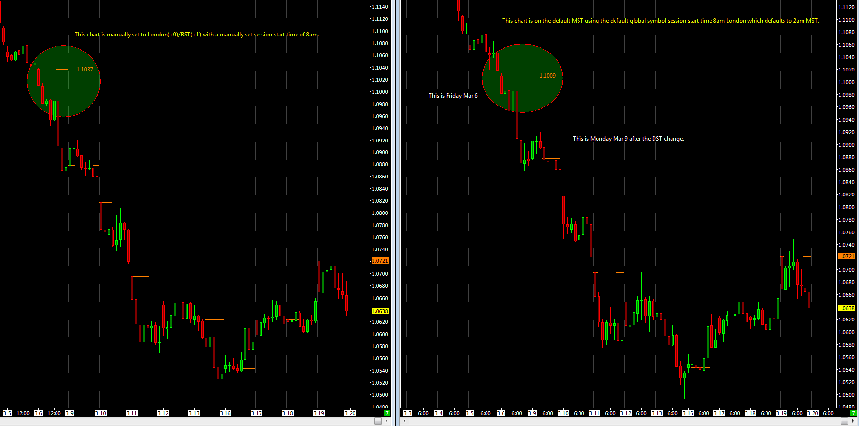 Ok sorry for the lack of clarity... I want to have the correct 8am London(+0)/BST(+1) Brent open during the couple weeks when US is on DST and London is still on GMT. US went to DST on March 8 and London goes to BST on March 29. I am based in MST and have the SC feed setup on MST. I have attached a pic of what it confusing me...you can see how the 2 charts are the same after the DST change on Mar8 but prior to they are different. |