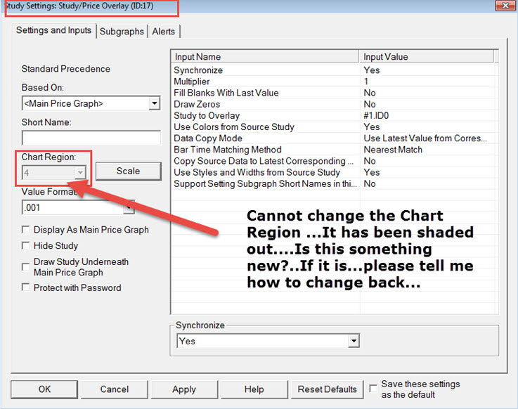 Greetings, I am attempting to use Study/Price Overlay but noticed today that the Chart Region reference number is "shaded out" and cannot place the study overlay on Chart 1...(See attached snapshot) Thanks in advance for your prompt response... David Dube Polaris Trading Group |
