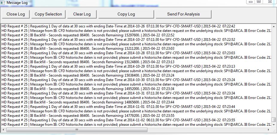 I follwed your suggestion. I removed the -BAAVG suffix. I pushed the add button and then I typed SPY-CFD-SMART-USD, nothing happend. The only thing I can see is the information "Downloading Historical Data. Bars may not appear until done", but in the end nothing happens. |