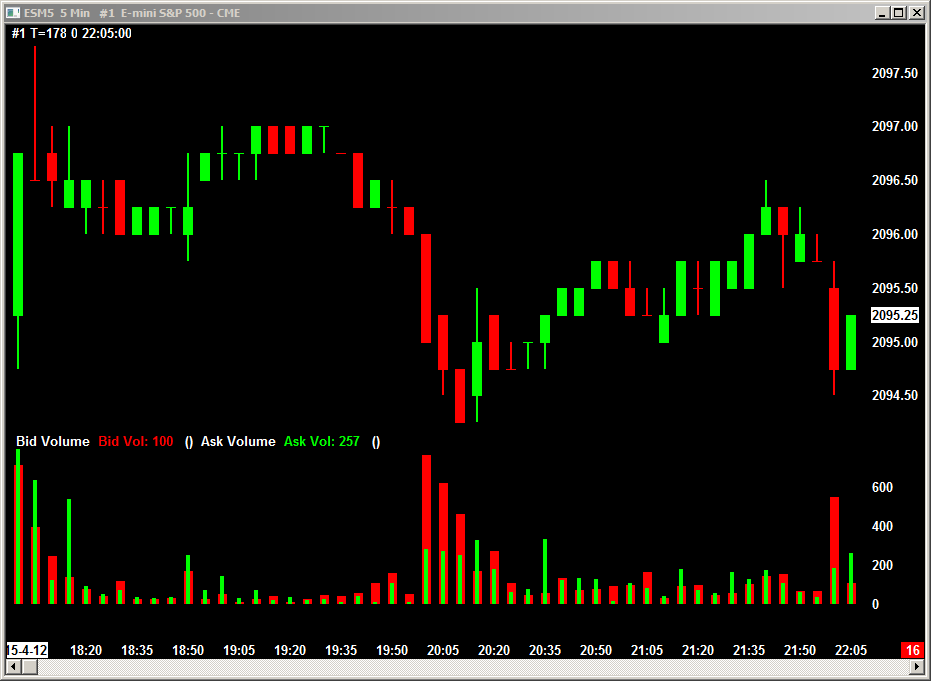 Your example has the bid volume narrower than the ask, but to do the opposite as in your text and in the attached pic, do this: -Move the Bid Volume study above the Ask Volume study in the Studies to Graph list -Set the bid volume's color to red, the Draw Style to Bar, and the Width to 9 -Set the ask volume's color to green, the Draw Style to Bar, and the Width to 4 |
