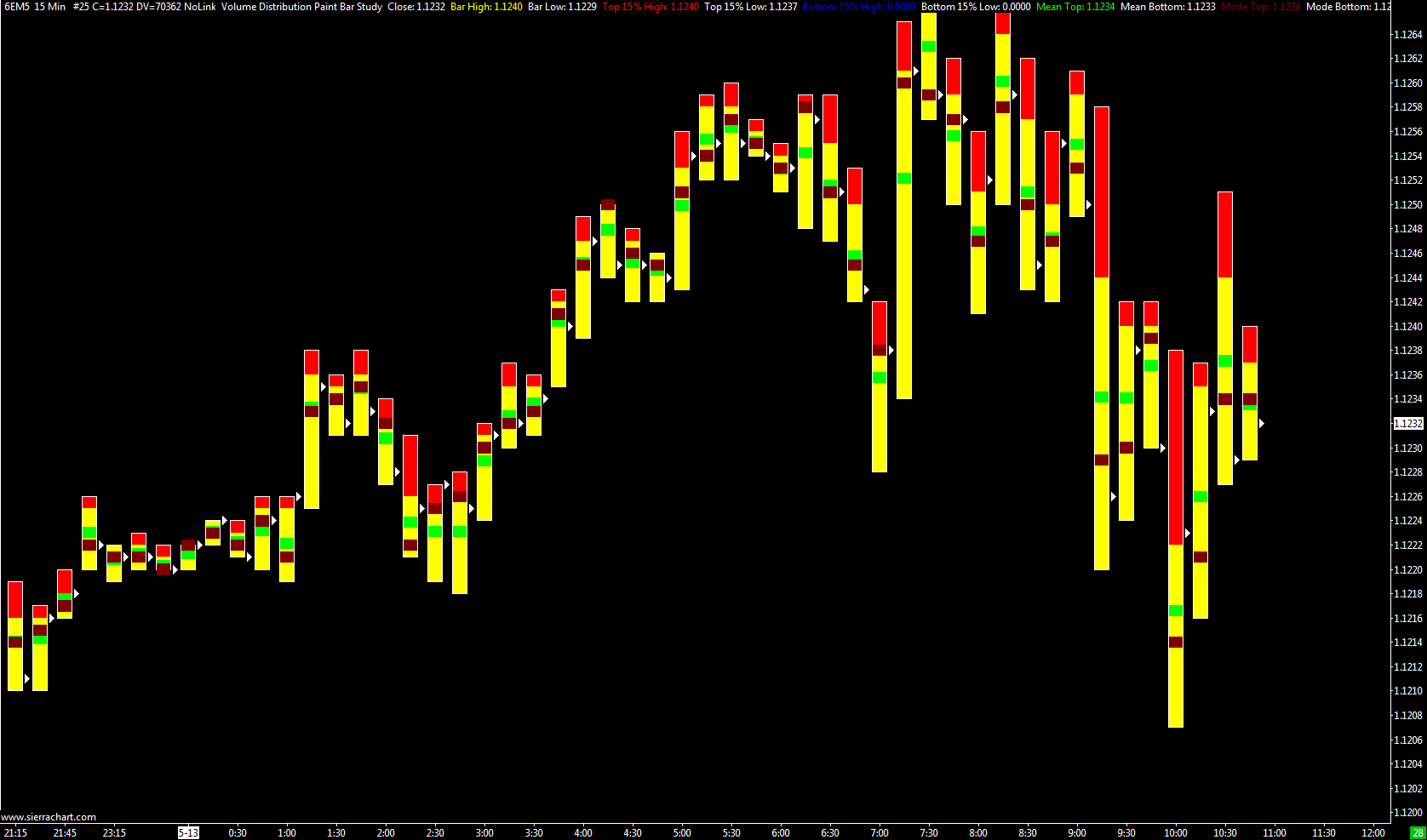 Hi, I'm looking at this study. I loaded a 15m 6E Chart with the default settings but can't see why the bottom 15% volumes are not printing - See enclosed. Any ideas? |