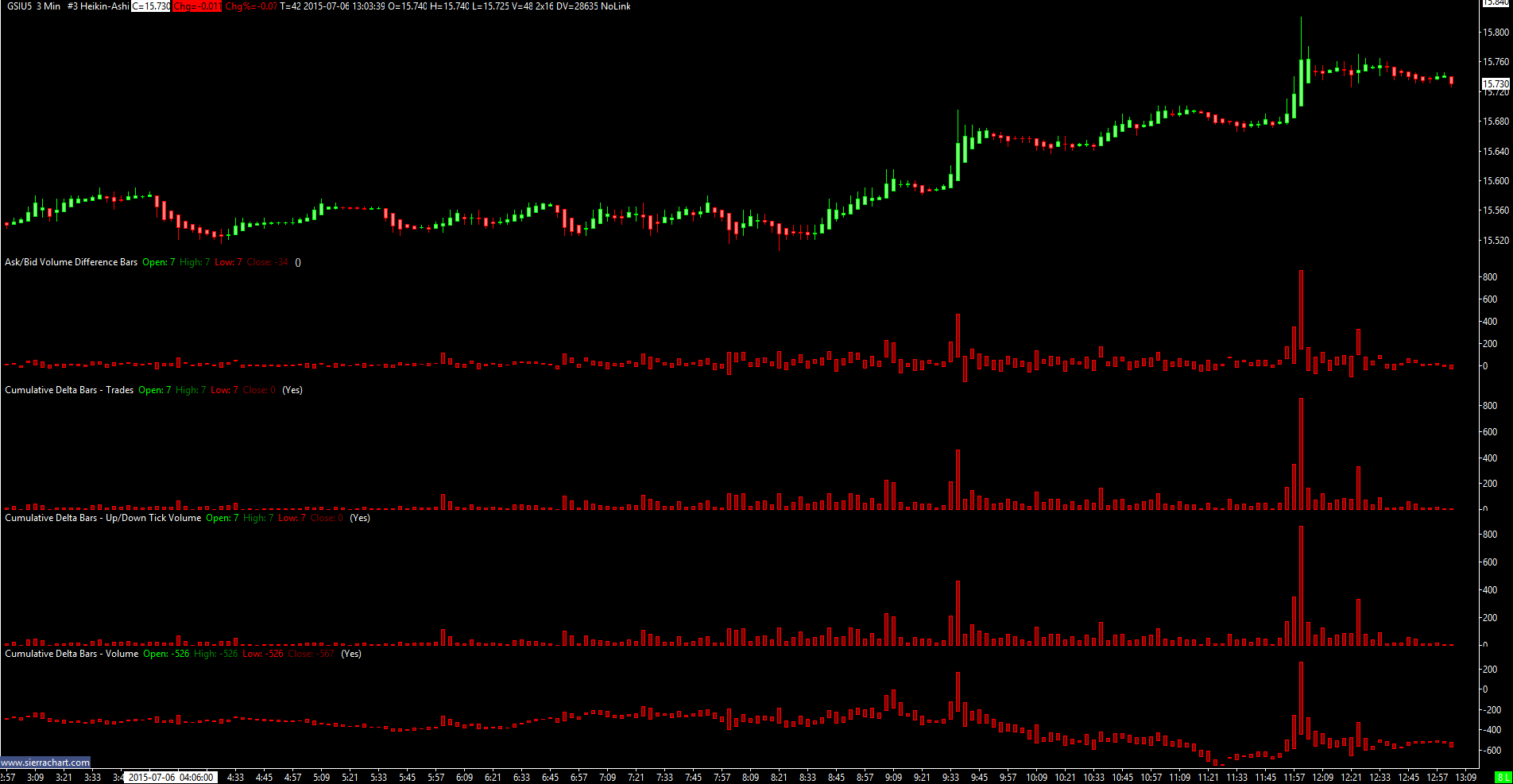 Hi When I use Heikin Ashi study as 'Display as main price graph' all the bid/ask study don't work. They paint the bars in the same Red color and are not accurate at all! i am talking about following studies. Please help. #Ask/Bid volume difference bar #Cum Delta Bars - Trades #Cum Delta Bars - Volume #Cum Delta Bars - Up/Down tick volume |