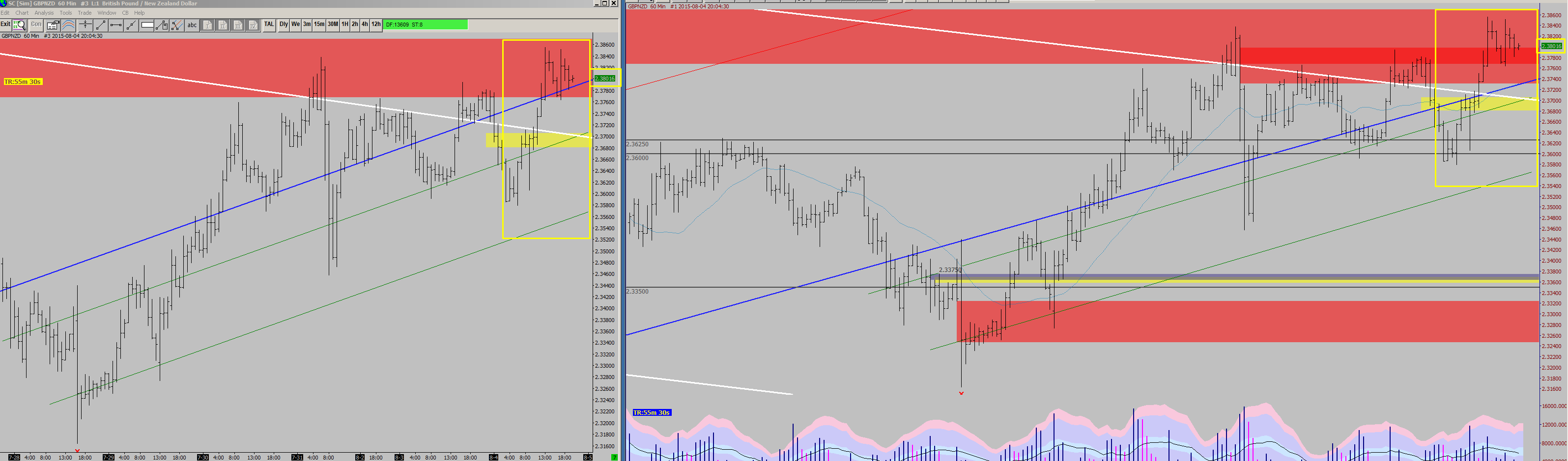 Here are two more pictures showing it a bit more clear. Notice the green lines are not even parallel on the second chart. The only difference of the charts is the number of days loaded.