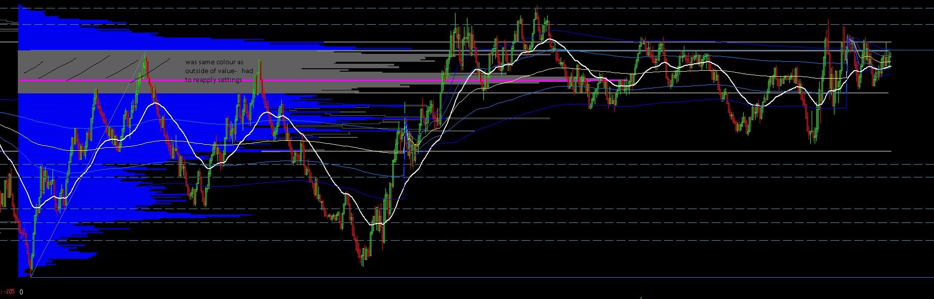 Hi - I have noticed that the value area in my Volume profiles isn't colouring correctly. (it may not display at all) - showing the whole profile as outside of value (sorry for the crude drawing, no pun intended as it's the CL)