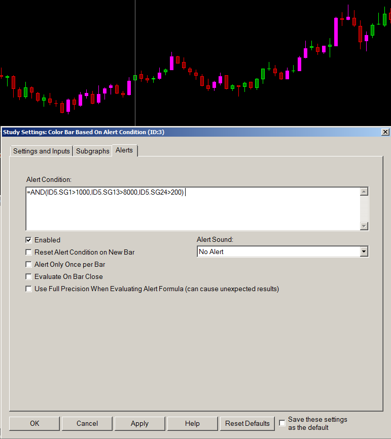 Add the Color Bar Based On Alert Condition study. Do not change the default settings. Go to the Alerts tab and enter your formula in the Alert Condition field. This will color the price bars when the alert is TRUE.