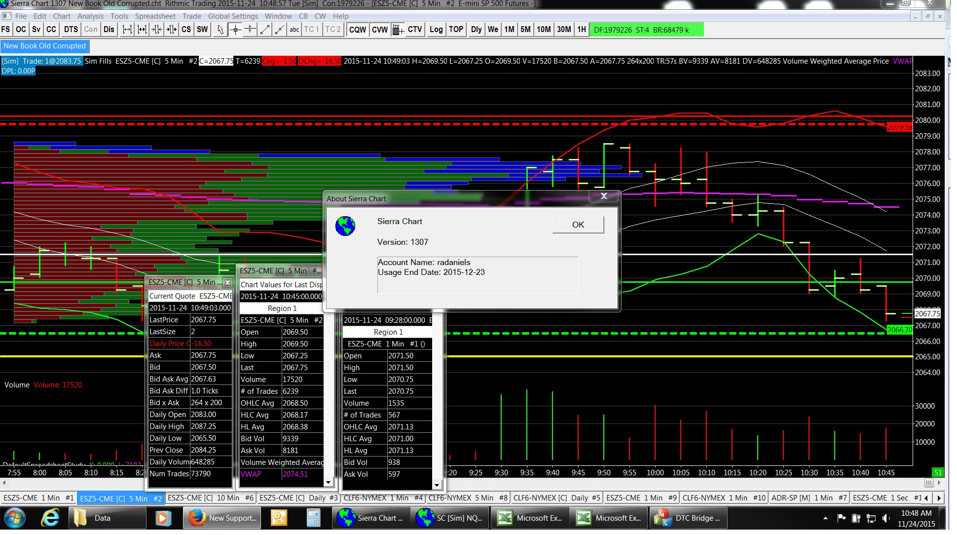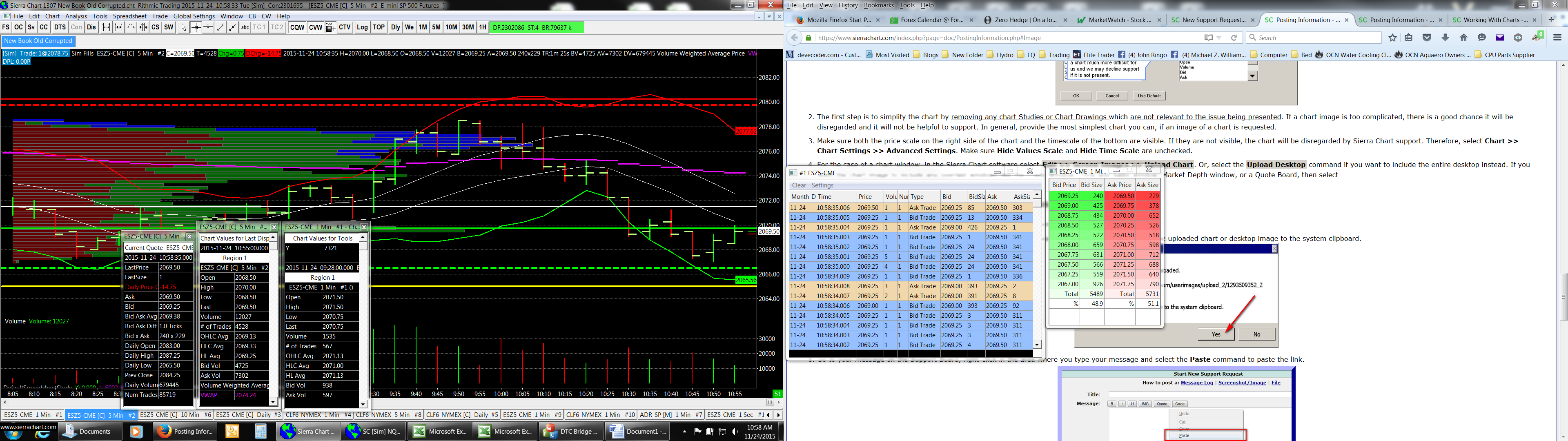 Its been a while since this went away. I used to be able to see in both "Chart Values for Last Display" and "Chart Values for Tools" windows it would show the net change since the last bar, or the bar that I had the cross hairs on. It will up on top display the change in the current bar where it up top My data feed is Rithmic and I am using Version 1307. I don't know if its that somehow I miss clicked something, something got corrupted or it is something that Rithmic doesn't do. http://www.sierrachart.com/image.php?l=1448380723483.png Attached is a pic of my desktop. So what do I do to get it back, or is it Rithmic? |