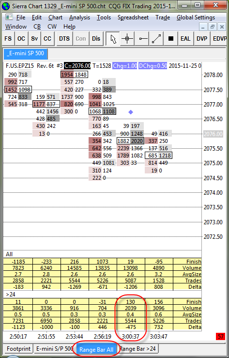 1. Open the chart and renamed (Range_Bar_All). Choose period Reversal Bar (6t). I add and configure Number_Bars. I add and configure Numbers_Bars_Calculated_Values. No filter is applied. All perfectly. (screen 10) Copy and rename the chart (Range_Bar_> 24). Apply filter. (screen 11) In Numbers_Bars_Calculated_Values Trades are not filtered. AvgSize wrong. Question: How Numbers_Bars_Calculated_Values count Trades larger than 24? 2. The same two charts. Overlaying filtered Numbers Bars Calculated Values in the chart (Range_Bar_All). Values Numbers Bars Calculated Values change when transferring. (screen 12) Question: How do I transfer the filtered Numbers Bars Calculated Values to another chart unchanged. (screen 13) Thank you Date Time Of Last Edit: 2016-02-10 09:33:16