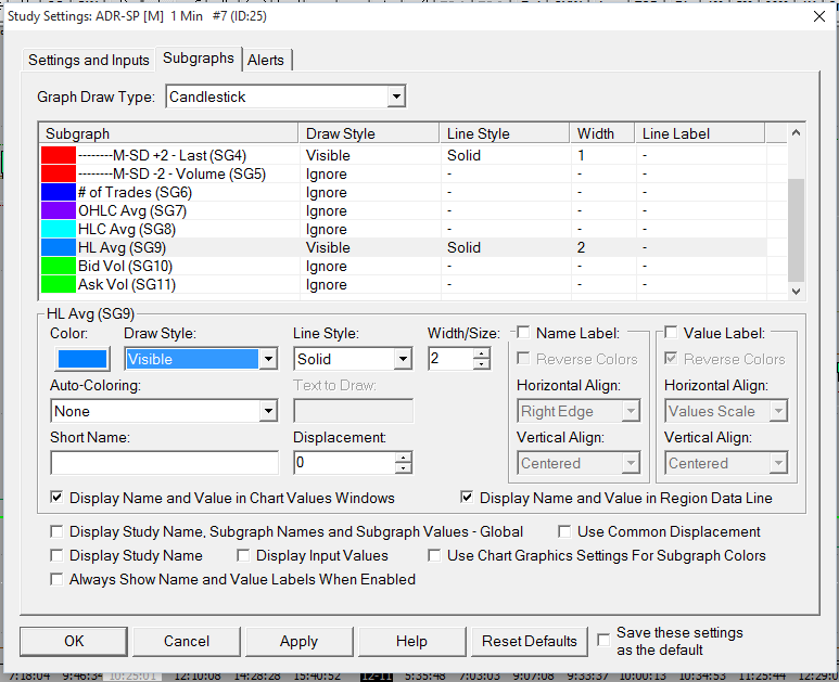 Okay I have switched to the Study/Price Overlay study and that now allows me to have different session times on the Source and Destination charts. However the reason I did not use this Study in the first place is I have never been able to figure out how to display the Overlay on the Destination chart as, say, a line when the plot of the Source chart is the main price graph ie it is Candlestick bars. When I read your documentation you referred to for the Study/Price overlay it seems to suggest you can overlay the main price graph from the Source Chart on to the Destination chart as a different Draw Style. See attached for my settings for the Study: I have tried changing the Graph Draw Type from 'Candlesticks' to 'Line on H-L Average'. I have also tried changing the Draw Style to H-L Average with it set to Visible and not Ignore. In both cases, when you save the changes it will not accept them and just reverts to Candlestick settings. |