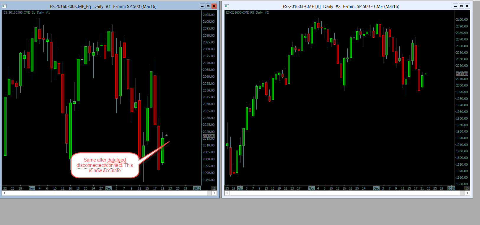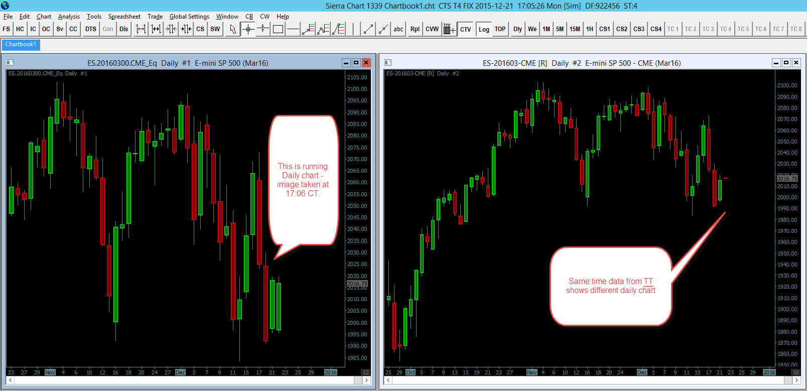 Attached are the images demonstrating the Daily Data issues with CTS. First image - When the datafeed is in connected mode the last daily bar is NOT correct. This also Doesn't get fixed when chart data is refreshed either. Second image - This gets corrected after datafeed is disconnected and then re-connected. Don't notice these issues with any other feeds/SC combination other than CTS/SC combination. Thanks |