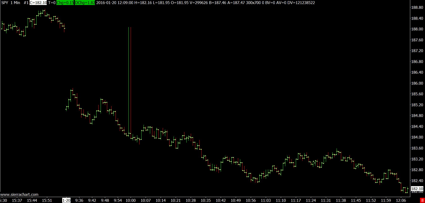 Why this is even being brought to our attention and IQ Feed is not simply addressing or explaining this on their side is beyond us. The data is so clearly within the 1 Minute historical data: http://www.sierrachart.com/image.php?l=1453403056106.png This is totally outside of our ability to do anything about. This is an excellent example of why support for Sierra Chart is not provided by anyone else, other than the engineers. This is why we always insist that users use the Support Board. It generally allows us to handle support efficiently so that we do not get overburdened most of the time. Sierra Chart Support - Engineering Level Your definitive source for support. Other responses are from users. Try to keep your questions brief and to the point. Be aware of support policy: https://www.sierrachart.com/index.php?l=PostingInformation.php#GeneralInformation For the most reliable, advanced, and zero cost futures order routing, *change* to the Teton service: Sierra Chart Teton Futures Order Routing Date Time Of Last Edit: 2016-01-21 19:05:40