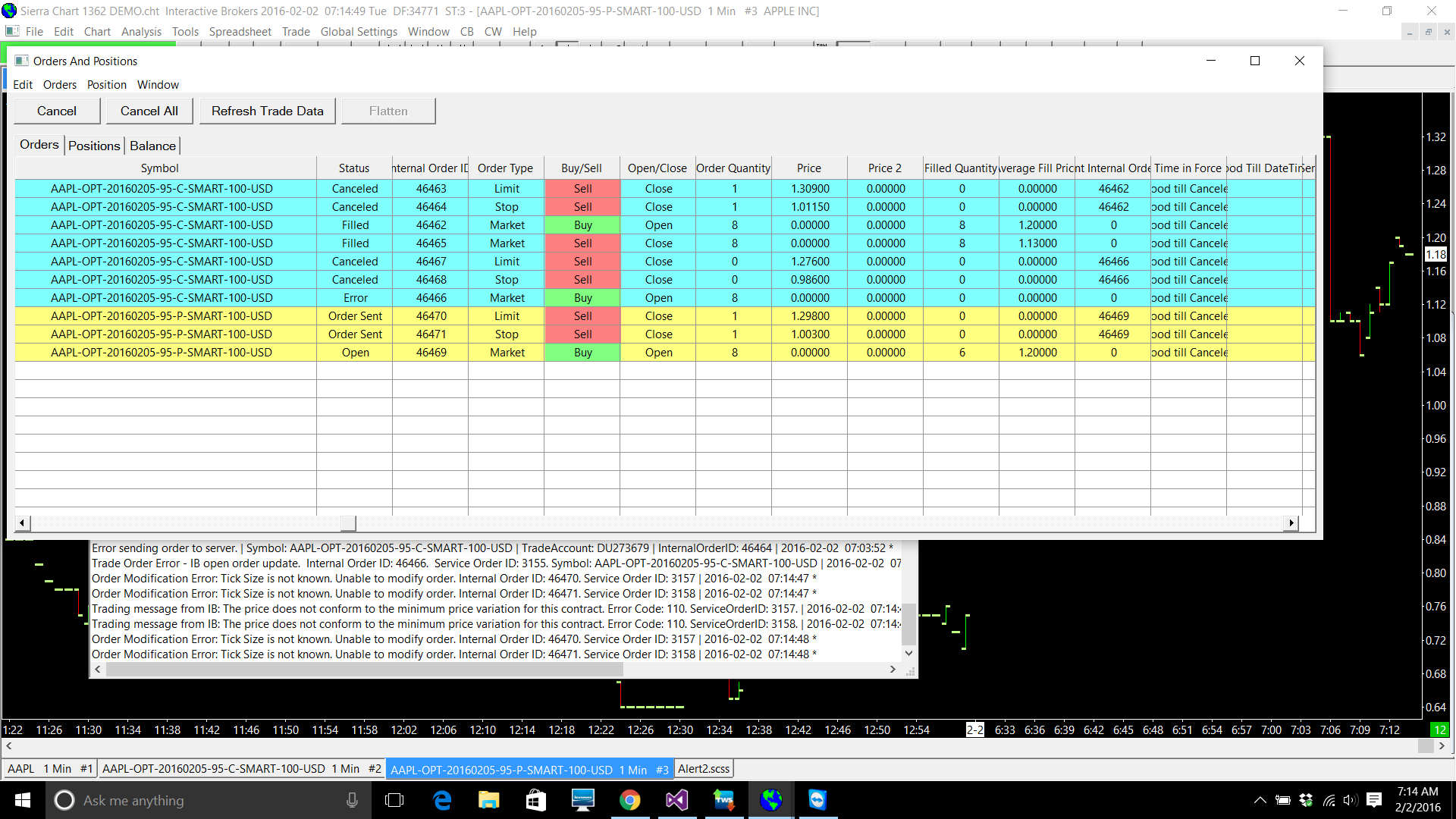 Trading message from IB: The price does not conform to the minimum price variation for this contract. Error Code: 110. ServiceOrderID: 3152. | 2016-02-02 07:03:37 Just another note the average price fill in IB (1.20) and Orders (1.20) under Orders and Positions is exactly the same, looking at Positions the fill price (1.21024) is different under Orders and Positions. Im unsure why this is, has this problem been an issue with other users before? Also the child orders are being sent at the exact same time as the parent order, can we modify orders after a duration of time, say 10 seconds? This might allow us to then attach child orders as the tick size can then be recognized. |