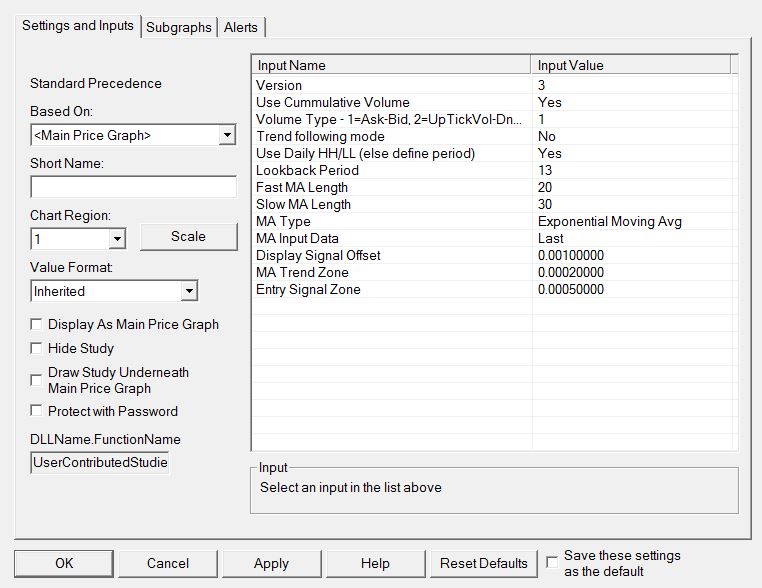 I am using the Delta Divergence study from the user custom studies section. It simply plots an up or down arrow to indicate divergence. I would like to set an alert to alert me when these arrows are printed but I have no idea what to type into the "Alert Condition" box. I have attached 2 pictures of what I am looking at. Thanks! |