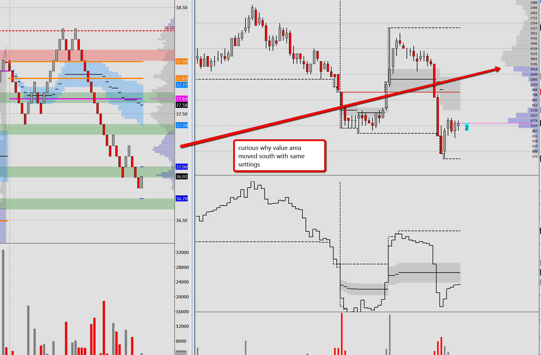 different charts but same settings in volume profile showing different value area. how come? |