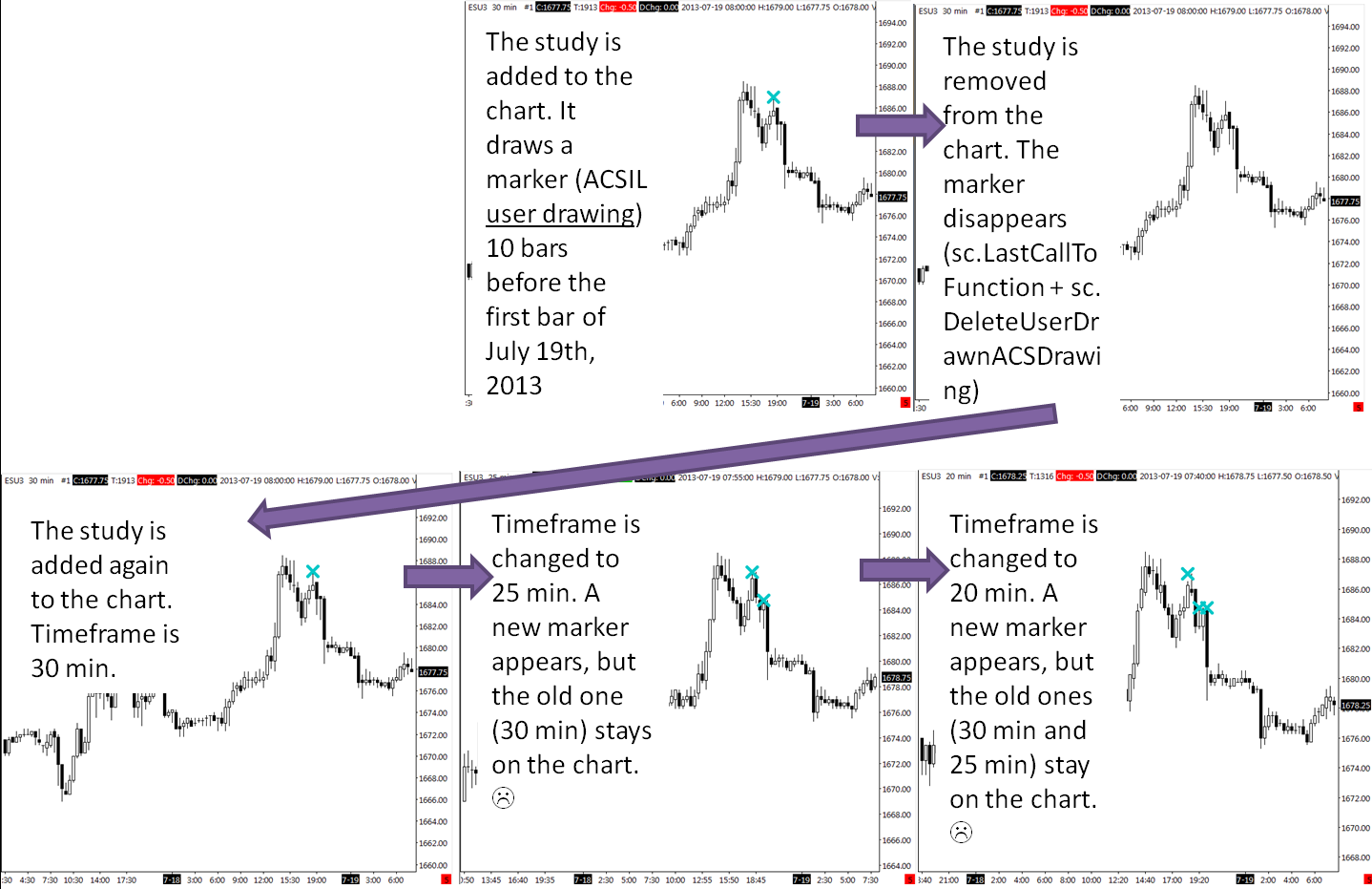 I have prepared (below) a minimal 40-line code in order to better show the issue I am reporting. This code draws a marker (ACSIL user drawing) 10 bars before the 1st bar of July 19th, 2013. When timeframe is changed, new marker appears, but old ones stay on the chart. How to programmatically delete them? The issue is illustrated on the attached picture, with comments embedded. #include "sierrachart.h"