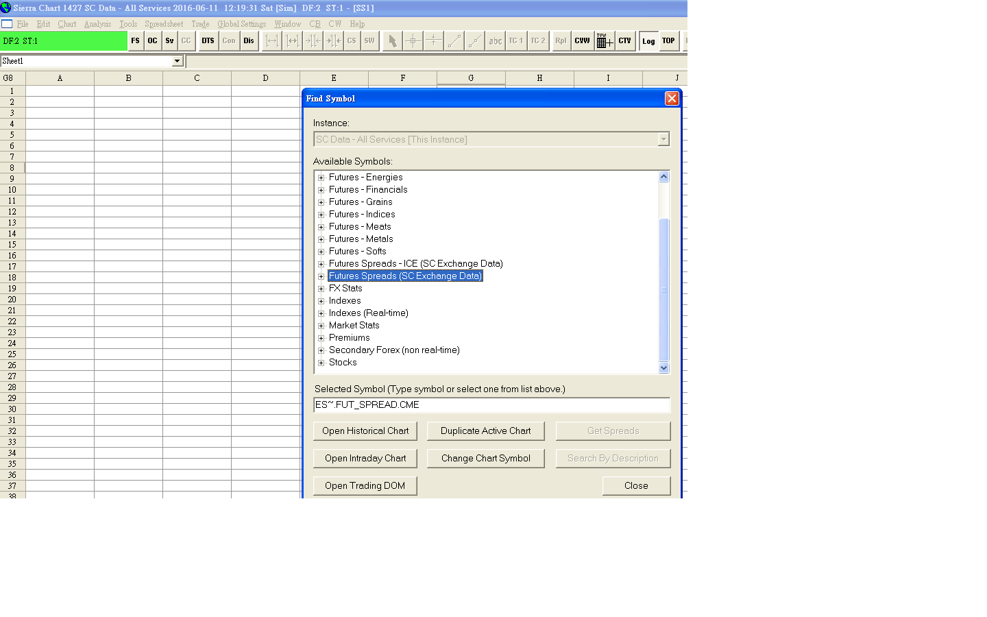 Referring to attached image - Symbol.png and Data Source.png, I would like to know on where to find SC Historical Data [This Instance] within Spreadsheets > Find Symbol, I could not find it from new installed Sierra Chart - Default.png. I can find any ES related symbols as shown below, but cannot find ESU6 Future symbol at all. ES~.FUT_SPREAD.CME | ES Futures Spreads under Futures Spreads (SC Exchange Data) E-Mini S&P 500 - GBLX under Future - Indices ES?##-$INX | S&P500 Futures to Cash Premium | S&P Indices Do you have any suggestions? Thanks to everyone very much for any suggestions New Spreadsheets have a new referencing method for chart data and studies which automatically adjust to studies being reordered. This prevents having to change formulas when studies are inserted or reordered. This is explained in this video. https://www.sierrachart.com/Videos/New%20Spreadsheets.wmv Date Time Of Last Edit: 2016-06-11 13:37:18