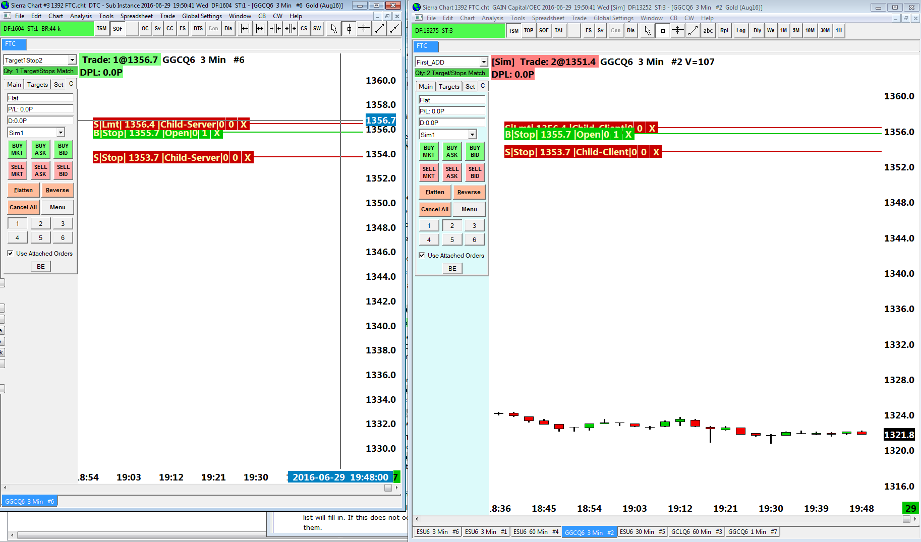 Hi I'm using a subinstance on same computer, seen at left in attached snap. Problem is the sub only places orders to the master instance when sub is in live mode and master is in sim mode, like in snap. If i switch the sub to live, and place order, i see this log GAIN Capital/OEC order update (Order reject). Info: Trade Account does not match Sierra Chart Trade Simulation setting. Internal Order ID: 2722. Service Order ID: (none). Symbol: GGCQ6 | 2016-06-29 19:56:51 * |