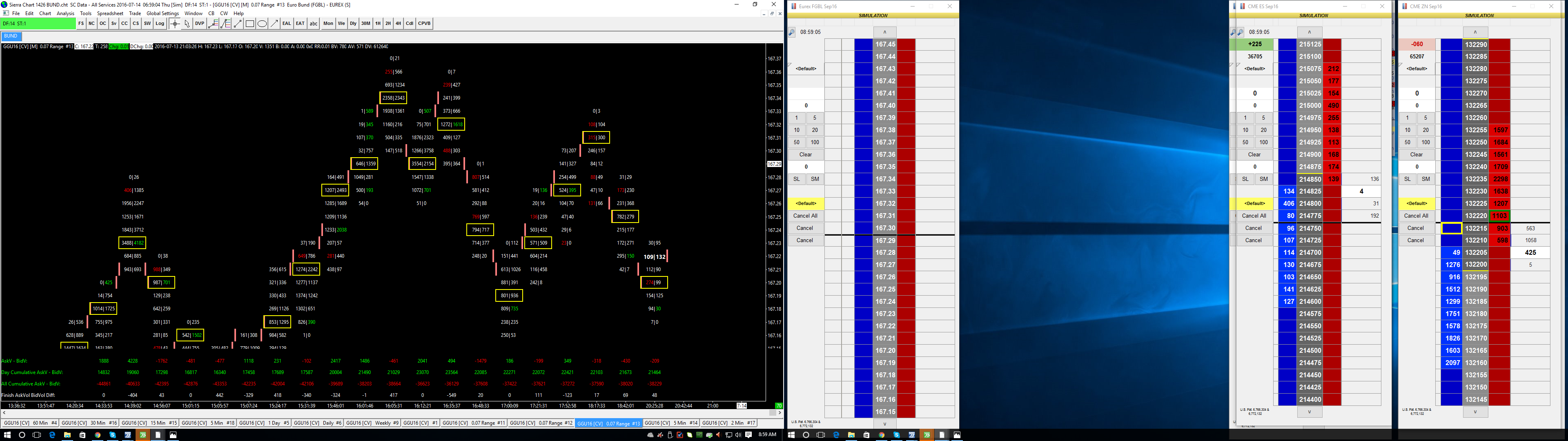 Hello, I noticed a huge anomaly in the numbers bars study and the cumulative delta when opening sierra on my laptop and on my pc. I have attached some pictures to illustrate the problem. No. 1 shows the numbers bar study and the cumulative delta when opened in my laptop and no. 4 shows exactly the same chartbook on my pc, but the cumulative delta is way off and the bid/ask volumes are not correct. I have also attached no.2 and 3 which is a typical 15m candlestick chart showing the volumes for each bar having no problem. The screenshots are from yesterday's trading session in the German Bund. I have no idea why there is so much difference in the bid/ask study when using my laptop or pc. I use the PC for trading and it seems that I have been looking at the wrong data because whenever I perform my analysis later at night using the laptop, the numbers bar study doesn't is completely different. Thank you...