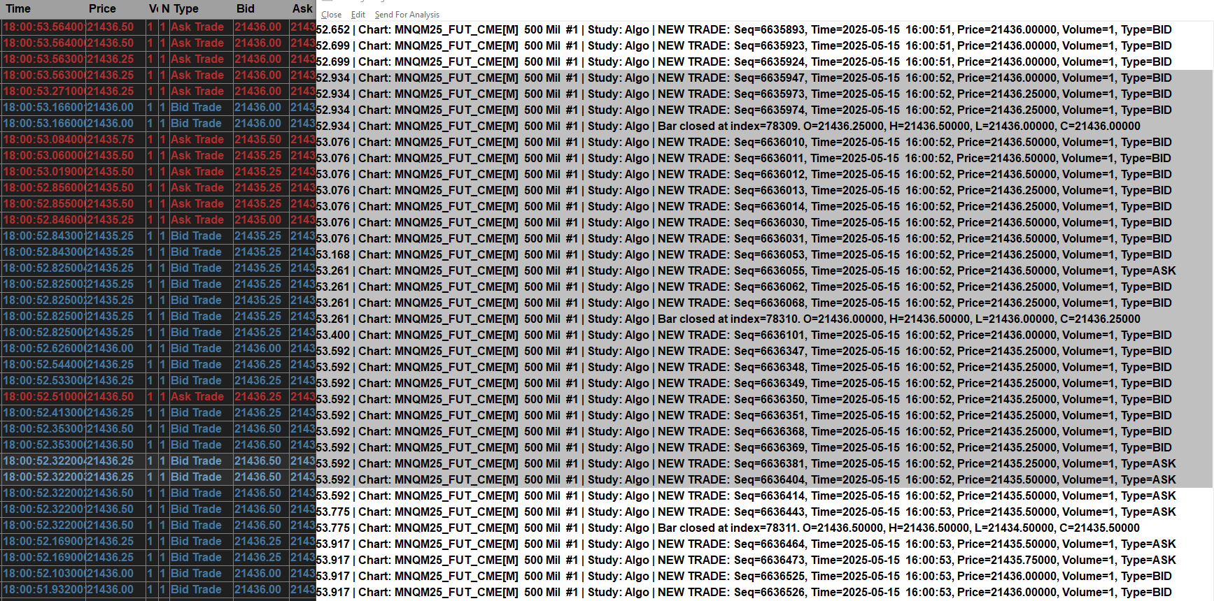 Please see the five attached images. The chart shows a price spike to 21,434.50, yet this level does not appear in either the Time & Sales feed or the debug logs. Could this discrepancy be contributing to the issue we noted earlier, or is there another factor I may have missed? (In replay mode the Time and Sales are being displayed properly) I have the option: -Combine Trades into Original Summary Trade (Data Feed and Exchange Specific) toggled to "No" -Intraday Data Storage Time Unit (List) is set to "1 Tick" Best regards, Dennz Date Time Of Last Edit: 2025-05-15 17:08:27