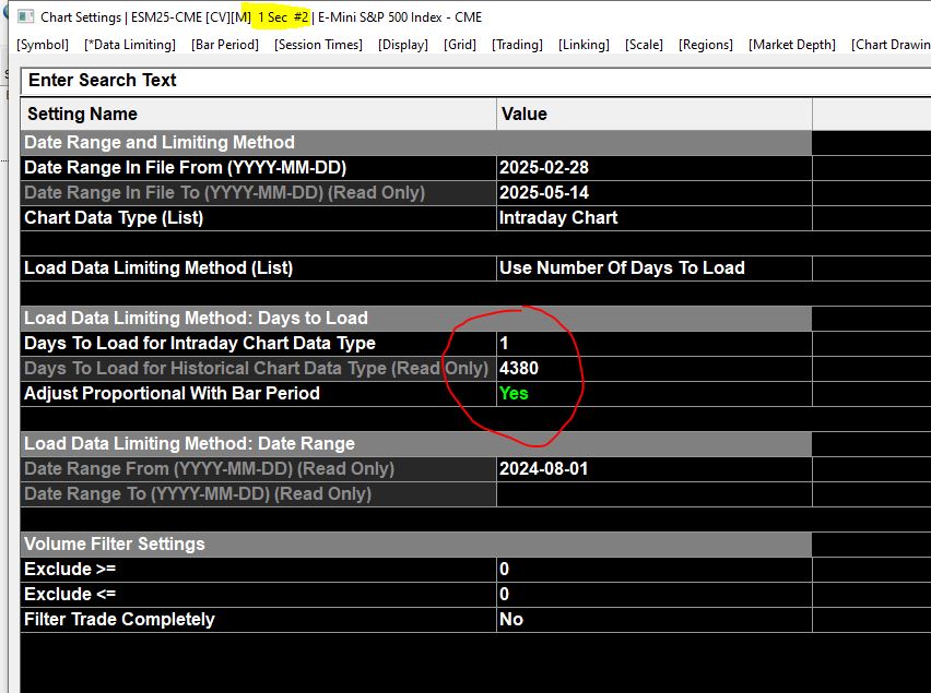 We are not really sure what you are wanting to do. If you want to see 1 second data for the current hour, then set your Bar Period to be 1 second. The entire chart will be in 1 second intervals, but once the data is loaded, it really does not matter. If you really do not want to see data older than the current hour, then you can use the "Color Bar Based on Alert Condition" to color the bars older than one hour to be the same as the background, so you will not be able to view them - they will still be loaded, and you can scroll through the time, but the bars will not be displayed. To do this, use an Alert Condition of the following: =BARTIME * 24 < FRACTIME(NOW()) * 24 - 1 Refer to the following: Color Bar Based on Alert Condition For the most reliable, advanced, and zero cost futures order routing, use the Teton service: Sierra Chart Teton Futures Order Routing |