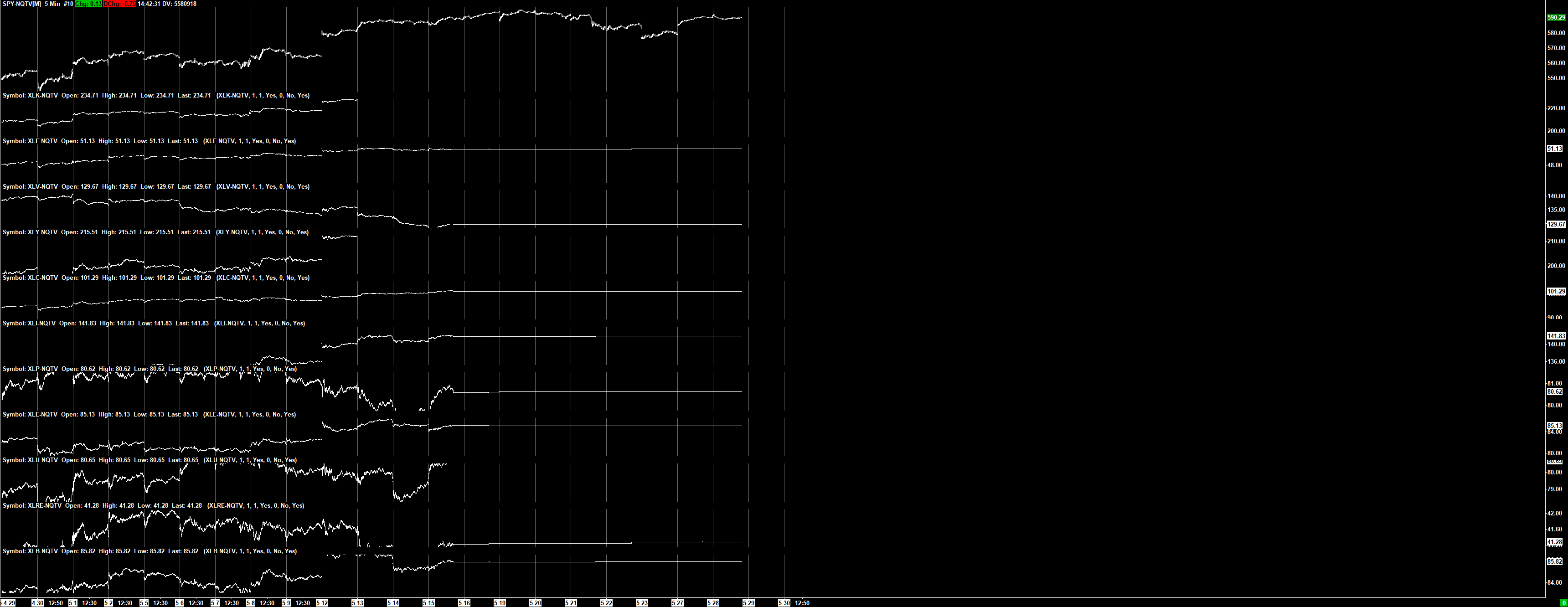 I have a chart which display market stats for symbols like XLX and XLY and it was working fine. Last few days it stoped working, price level works on the main chart area but the added symbols does not show correct data. See attached.
