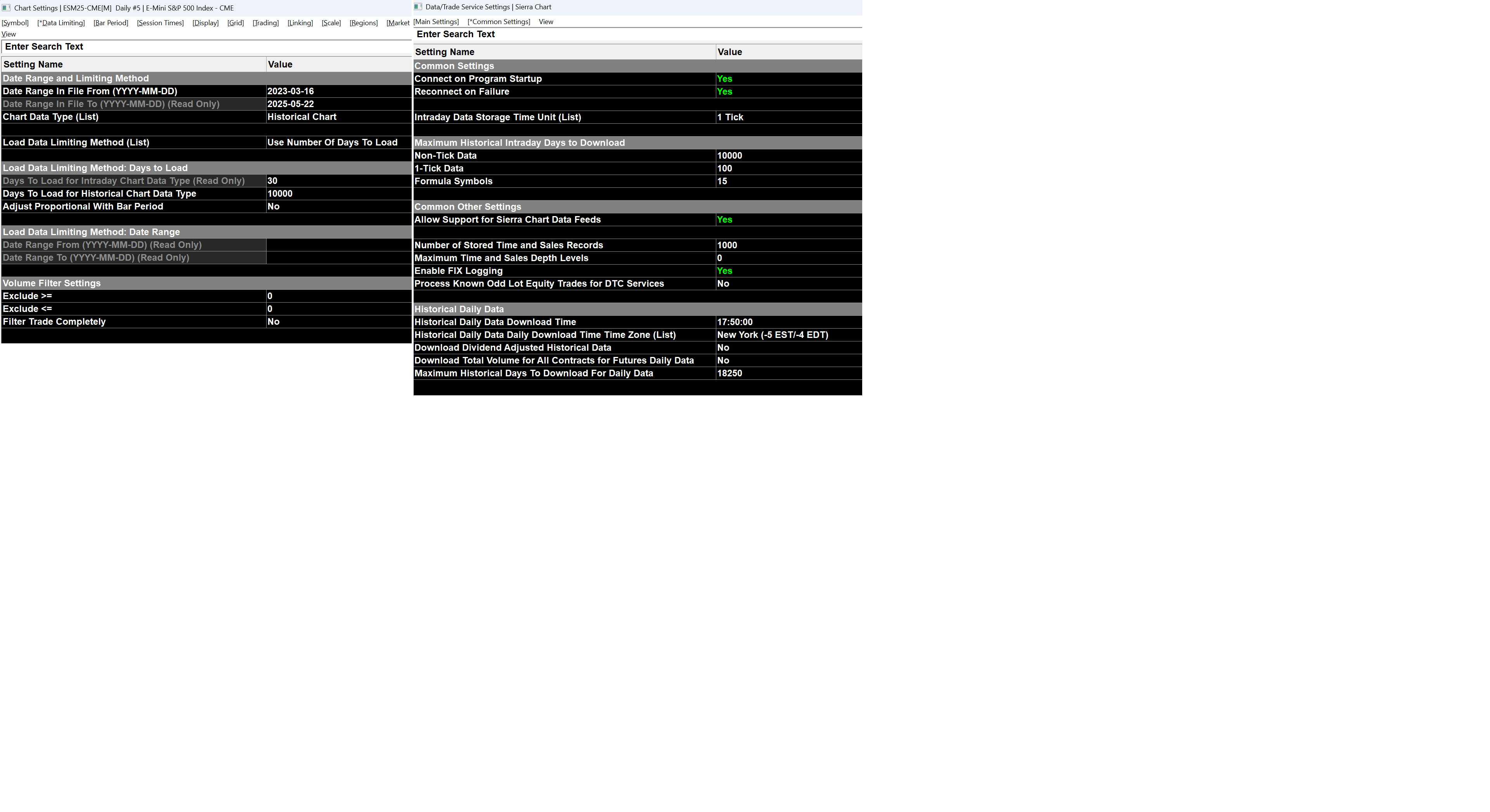 Hi, I'm trying to load 10000 days of ES futures data, historical OHLC chart, but I can't make it work. I tried both the number of days data limit and the date range. There should be some data limiting that I can't find. When I try to change the value in "Date range in file from" nothing changes, and the value is restored to 2023-03-16 and nothing changes if I set "use number of days to load". Historical intraday data works fine. My settings in Data/Trade service settings are: Maximum historical days to download for daily data: 18250 Thanks to whoever can help me |