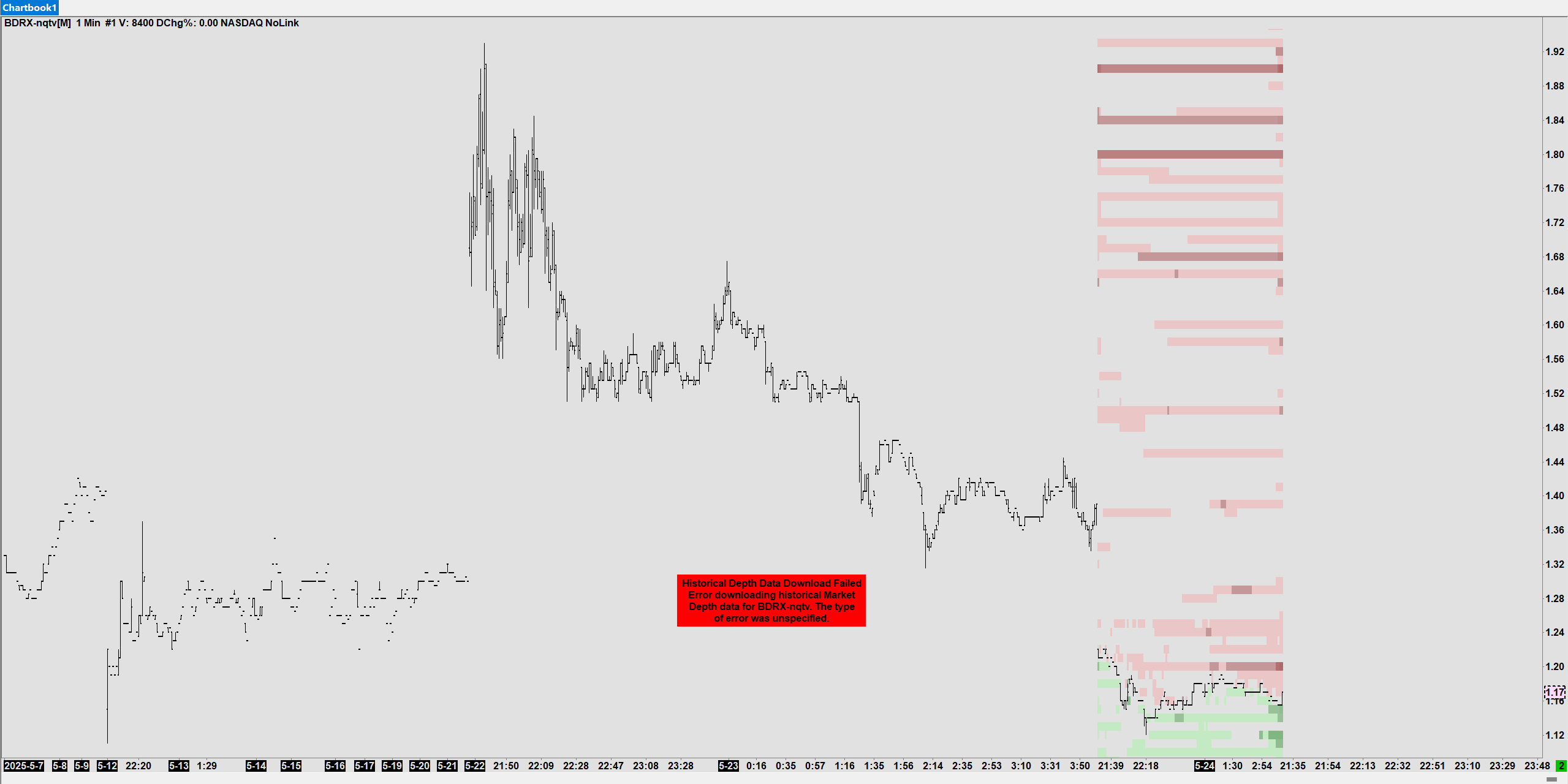 I'm trying to download historical market depth data for stocks with the "-NQTV" suffix, but I keep receiving the error message shown in the screenshot below. The error says: "Historical depth data download failed. Error downloading historical market depth data for BDRX-nqtv. The type of error was unspecified." I've followed all the instructions under "Downloading Of Historical Market Depth Data" on this page Market Depth Historical Graph: Downloading Of Historical Market Depth Data Are there any other ways to fix this issue? |