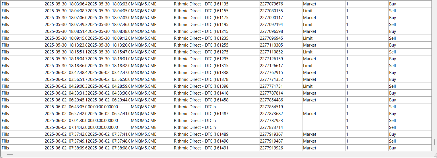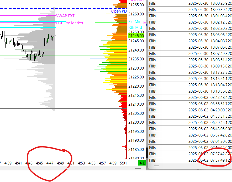 This is an issue with Rithmic and the fact that they are either not keeping the information available, so it is not there when you reconnect later, or they are not sending it properly when you reconnect. In either case, this is something Rithmic needs to deal with. second, it seems that the logged times are off? the most recent time in the trade log is 7:37:49 while the chart is only at 4:49 (see the red circles).