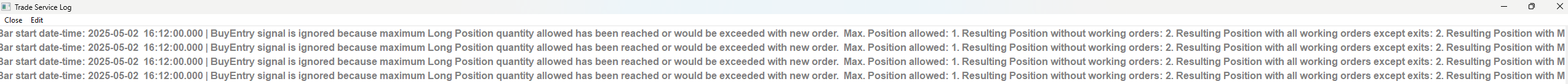I'm running the replay using Denali/Teton. Regarding alerts, whenever an order is generated, my system sends an alert to notify me that an order is being generated. The Trade Service Log is stating that max positions has been reached as the reason for not sending orders. This is weird as the Max Positions in the Trade Service Log is listed as 1 but the Max Position Size Allowed isn't set in my system. I haven't explicitly set sc.MaximumPositionAllowed. Also if the Max Positions was 1, that shouldn't prevent the system from trading. It should only prevent a single trade quantity from exceeding this amount. The behavior I'm experiencing is as if after a single trade has been placed, no further trades are allowed. Date Time Of Last Edit: 2025-06-02 13:55:13
