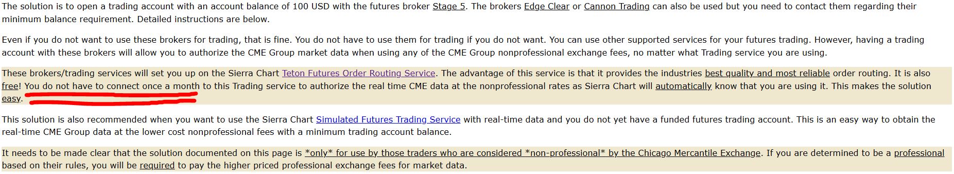 If you are specifically setup on the "Teton Order Routing Service", then you do not need to go through the connection once a month. But if you use a different order routing service (CQG or Rithmic) or connect to Interactive Brokers, then you will need to go through the process. 1. That is fine. 2. Package 11 is good. 3. This is fine. 4. You do not need to setup an account with Interactive Brokers. The account with Stage 5 will work to satisfy the CME Group Non-Professional requirement. 5. Nothing else, apart from actually doing the setup. For the most reliable, advanced, and zero cost futures order routing, use the Teton service: Sierra Chart Teton Futures Order Routing |