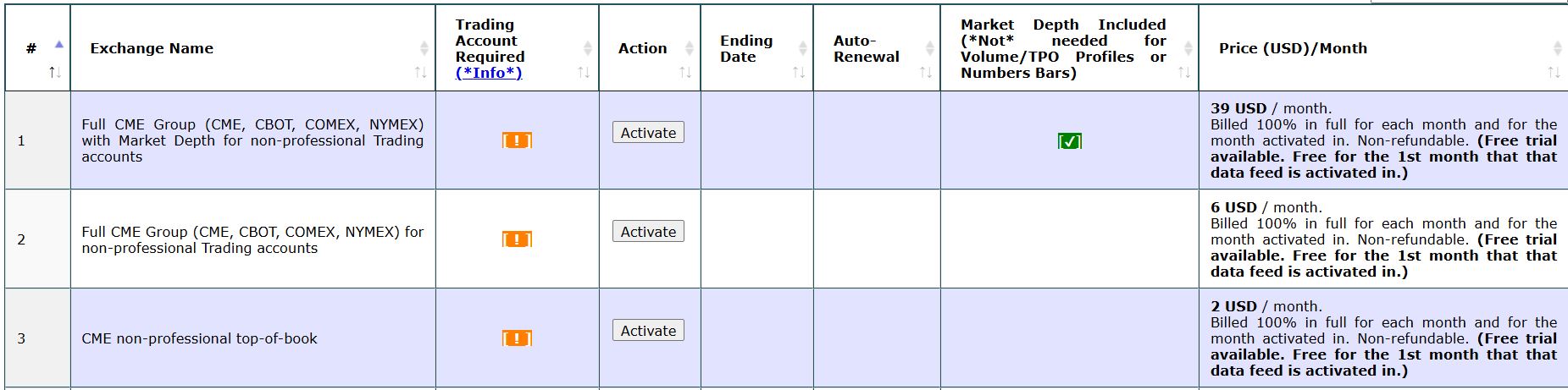 The "CME Non-Professional Top-of-Book" is all you need if you only need data for symbols traded on the CME exchange and you do not need Market Depth data (which you do not need for the TPO). Since this is your first time using the data for the CME Group from our Denali Exchange Data Feed, you will not be charged when you activate the exchange. You get the remainder of the month in which you activate the exchange for free. So you will not need to pay the $3.00 for the exchange fee until July 1, 2025. The data for the exchanges that make up the CME Group (CBOT, COMEX, and NYMEX) will be delayed streaming data for your account. For the most reliable, advanced, and zero cost futures order routing, use the Teton service: Sierra Chart Teton Futures Order Routing |