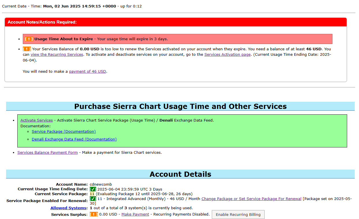 Currently my account control panel shows Current Usage Time Ending Date: 2025-06-04. I had selected to evaluate Package 12 but my current usage time expired after selecting to evaluate and I had to use the emergency account activation feature to continue using Sierra Chart for the evaluation period. My current service package shows as follows: Current Service Package: 11 (Evaluating Package 12 until 2025-06-28, 26 days) Any assistance or clarification would be appreciated, thank you. |