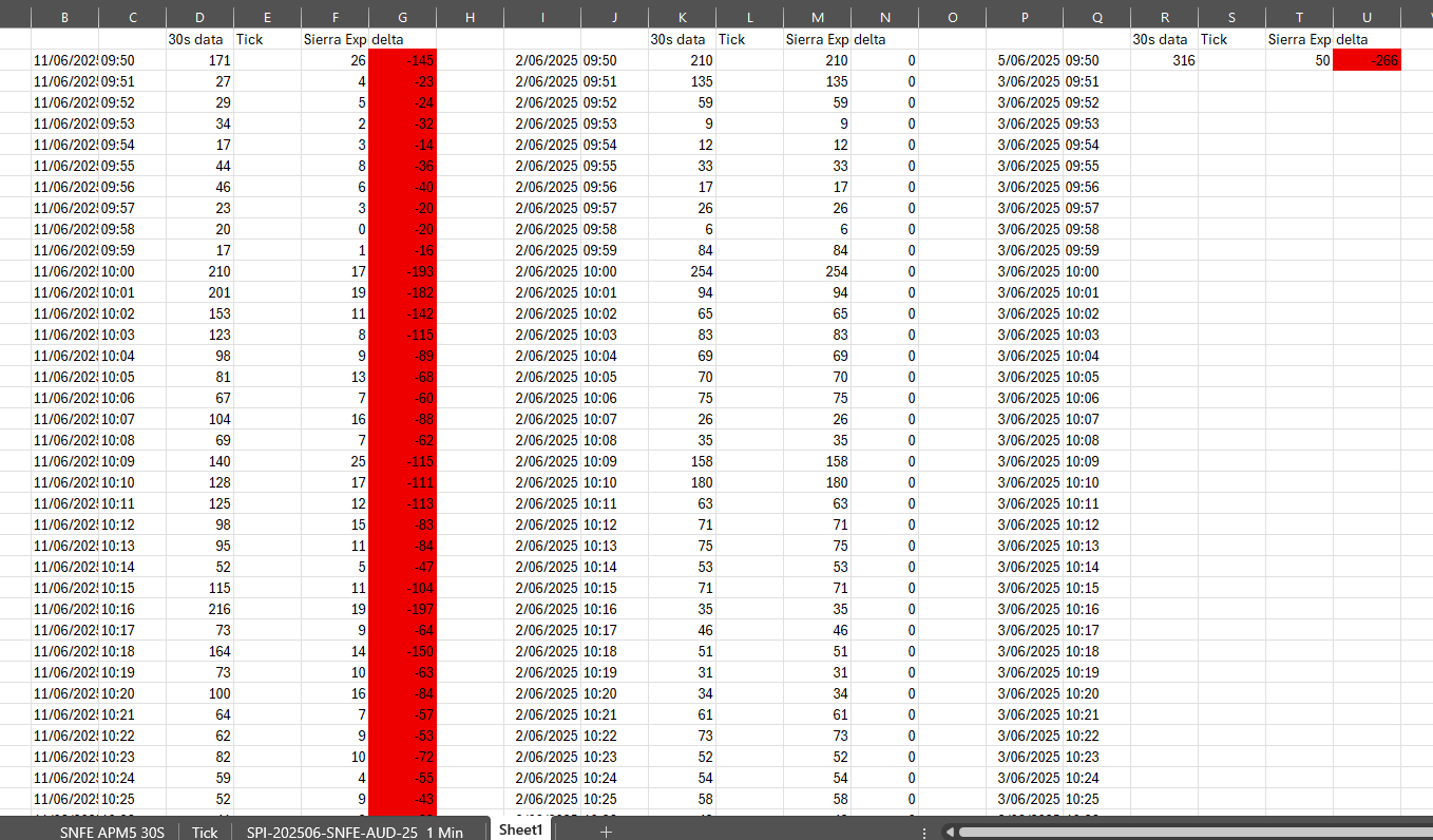 I've actually just spent some time analysing this issue, and comparing to an API i use and its actually different. i'm using rec.historical for the API. i've exported some API data column D and sierra column F, and comparing the two in G can see the variance or delta. this doesnt persist into all history. see column i is from last monday last week 02/06/2025 using DD/MM/YYY convention and its exactly the same. it looks like midway through 04/06/2025 is when the data becomes anomalous from Sierra. i've also cross checked manually vs what is showing directly in TWS and it appears to align with rec.historical for the sample periods shown. this is looking at 1 min chart data date time shown is sydney 9:50am which is market RTH open. |