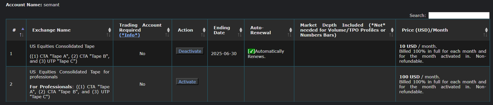 Hello: My data feed for QQQ is delayed by about 10-15 minutes even though I have "US Equities Consolidated Tape ((1) CTA "Tape A", (2) CTA "Tape B", and (3) UTP "Tape C") Equities Consolidated Tape" service active. What do I need to do to eliminate the delay? My futures data feed is not delayed. |