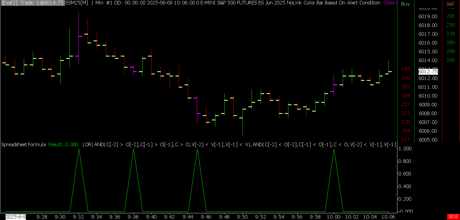 The top, where the bars are colored is from the "Color Bar Based on Alert Condition". Where you enter the condition on the "Alert" tab. Refer to the following: Color Bar Based on Alert Condition The bottom is from the "Spreadsheet Formula" study. In this case, you need to reformat your condition to be on a single line. Refer to the following: Spreadsheet Formula For the most reliable, advanced, and zero cost futures order routing, use the Teton service: Sierra Chart Teton Futures Order Routing |