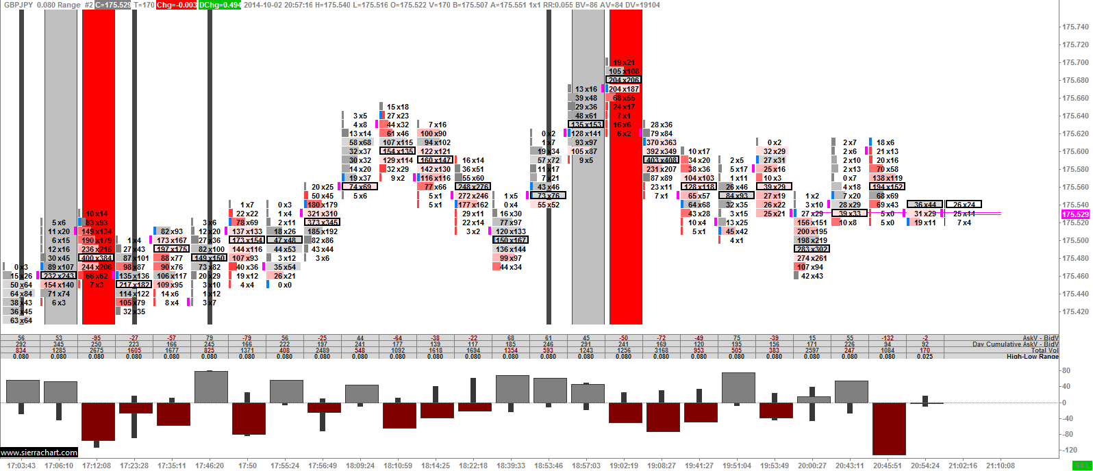 http://www.sierrachart.com/image.php?l=1412308638988.png I have been using attached footprint chart layout very successfully over last 9 months. Since 2 days ago,without any changes of settings by myself, there appears to be large vertical random columns (candles maybe?) behing various footprint bars, which are obviously very distracting. Please suggest how to remove them. Thank you in advance. |