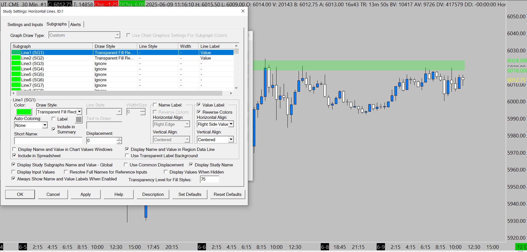 I am using the Horizontal Lines study to fill in a rectangular area between 2 numbers- 6018 and 6024. If I wanted to adjust the rectangle by by a given number, lets say 1.001, ao 6018/1.001=6011.99, 6024/1.001=6017.98. So in this case draw a rectangle area between 6011.99 and 6017.98.