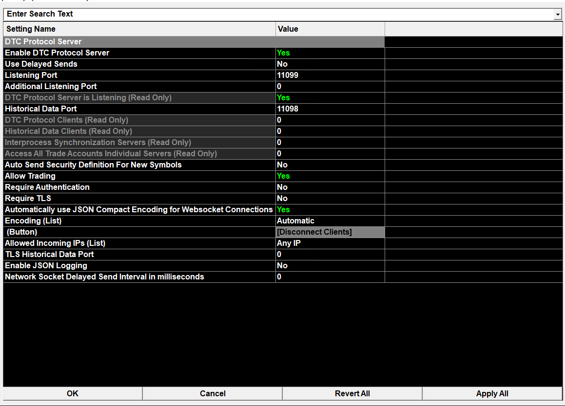 I'm trying to configure order routing to Sierra Chart via the DTC Protocol Server (port 11099), using SubmitNewSingleOrder messages. The server is reachable, and my external client is connecting successfully, but order submissions are being ignored. As you can see from the attached settings screenshot, the DTC Protocol Server is showing “Listening (Read Only): Yes”, despite having “Allow Trading” explicitly set to Yes. This seems contradictory — I would expect “Read Only” to be No if trading is allowed. I’ve tried both Sim1 and a connected live account from my broker (Clear Edge). In both cases, the server accepts login and symbol requests, but trade orders are not acknowledged or filled. Can you confirm: Are my settings correct for enabling write access to the DTC server? Should the “Read Only” flag be showing “No” when “Allow Trading” is enabled? Is there anything on your end that needs to be enabled to allow order submission via DTC? |