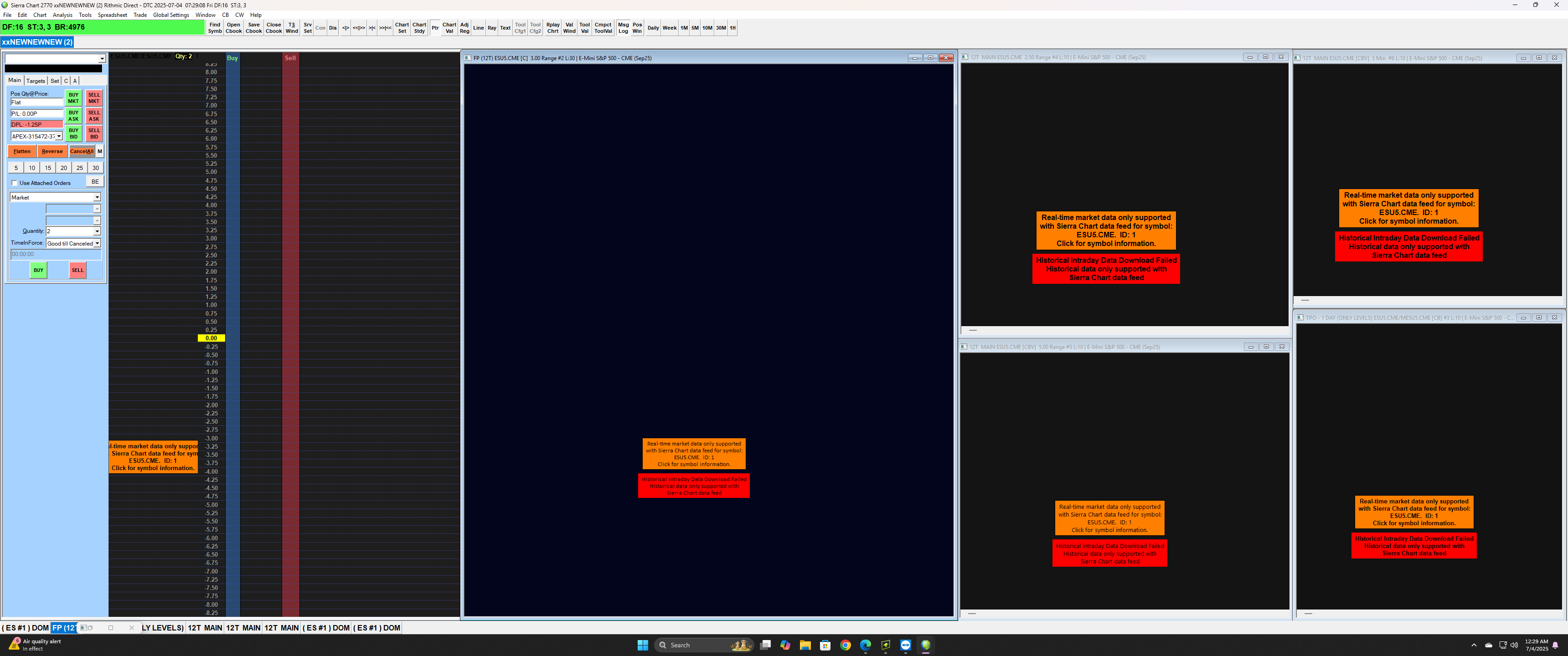 Dear Support, after updating to the latest version of Sierra Chart, the daily charts no longer download data for any symbol. I tried deleting the files in the “Data” folder to force a new download, but the issue remains. The PC is set up with 4 monitors, each displaying a daily chart. Sierra Home is on Monitor 2 Could you please help me resolve this? If needed, I’m available for remote assistance via TeamViewer (user ID and password are attached). Date Time Of Last Edit: 2025-06-11 14:32:57