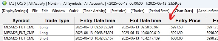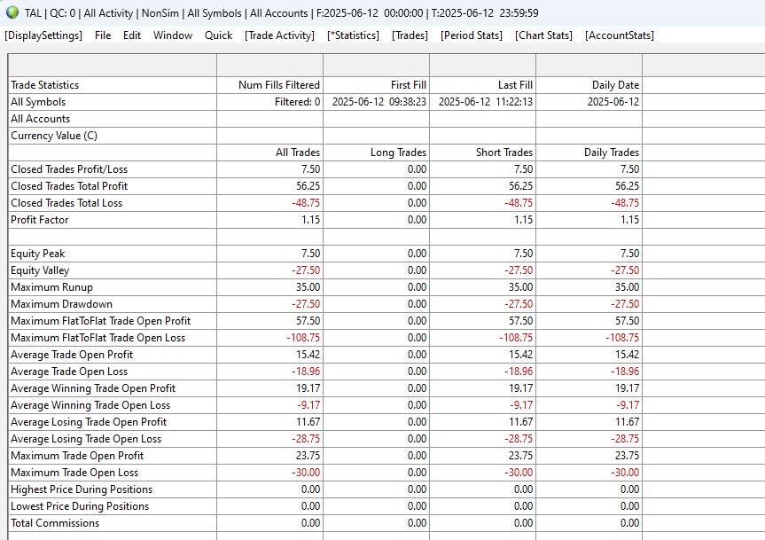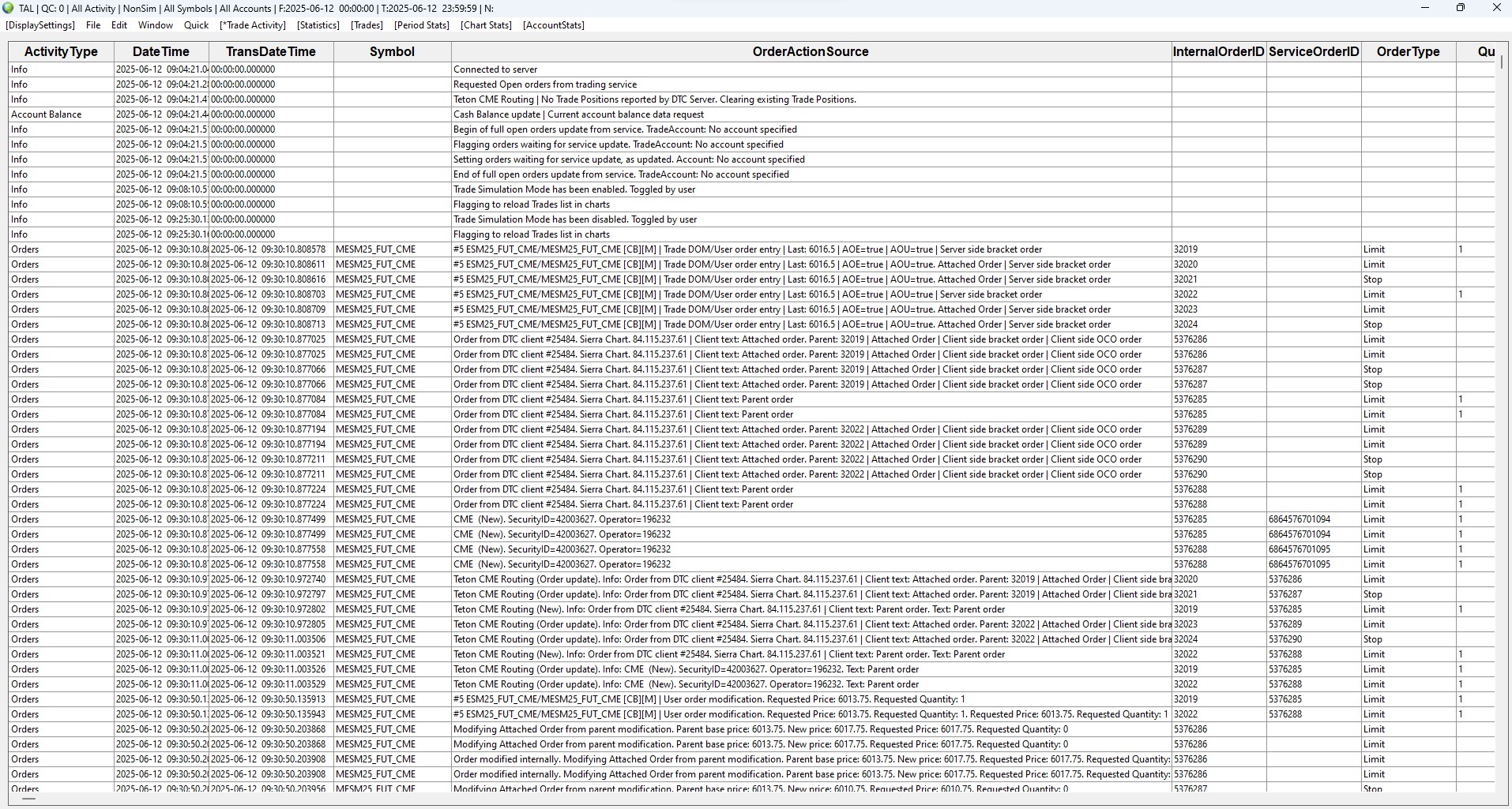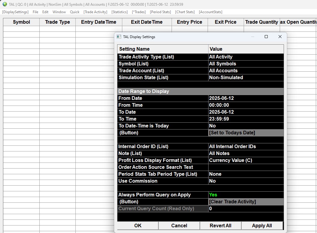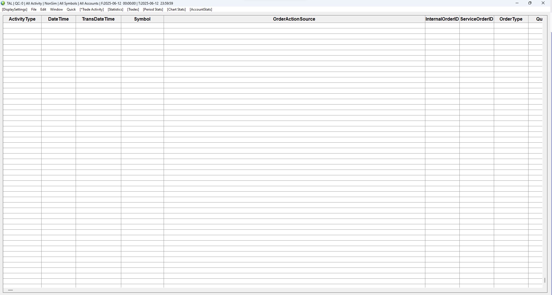 QC = 0 so no query is outstanding. Usually I have 4-20 trades per day so there is not really a big amount to read from the files. The strange thing is that only the Statistics will be displayed correctly. So the information must be readable from the file(s). All other buttons like Trade activity, Trades, Period stats, Chart stats and Account Stats show nothing. When I restart Sierra everything is fine the first time I open the Trade activity log. When I close it and open it again only the Statistics will be displayed. Trade Activity Log: Trade Activity Not Displaying or Clearing (Improving Trade Activity Query Performance) -> Do you mean I should clear all my data under D:\SierraChart\TradeActivityLogs? I would loose all statistics in this case isn't it? Currently all files use 205MB not really much. I do not see any errors concerning the Trade Activity Log in the Trade Service log(account number is masked with XXXXXX) 2025-06-12 09:04:21.042 | Unset | File is empty: TradeActivityLog_2025-06-12_UTC.XXXXXX.data 2025-06-12 09:04:21.043 | Unset | TradeActivity files query time: 0.002403 seconds. Entries: 0. Current queries: 1 2025-06-12 09:04:21.178 | Unset | TradeActivity files query time: 0.011247 seconds. Entries: 0. Current queries: 2 2025-06-12 09:04:21.188 | Unset | TradeActivity files query time: 0.009297 seconds. Entries: 0. Current queries: 1 2025-06-12 09:04:21.325 | Unset | RemoveDuplicateFillActivity | TradeAccount: XXXXXX. DatesOfRecordsToInsert: 2025-06-11, . MostRecentFileNameSearched: TradeActivityLog_2025-06-11_UTC.XXXXXX.data. DuplicateRecordsRemovedCount: 1. OriginalRecordsToInsertCount: 1. RecordsToInsertCount: 0 2025-06-12 09:04:21.325 | Unset | TradeActivity files query time: 0.006343 seconds. Entries: 0. Current queries: 1 2025-06-12 09:04:21.331 | Unset | Teton CME Routing | Received 1 historical account balance updates for account: XXXXXX. Inserting into Trade Activity Log. 2025-06-12 09:04:23.917 | Unset | TradeActivity files query time: 0.010488 seconds. Entries: 0. Current queries: 1 2025-06-12 09:04:34.702 | Unset | TradeActivity files query time: 1.452118 seconds. Entries: 1223. Current queries: 3 2025-06-12 09:04:36.084 | Unset | TradeActivity files query time: 1.382113 seconds. Entries: 1223. Current queries: 3 2025-06-12 09:04:37.495 | Unset | TradeActivity files query time: 1.410759 seconds. Entries: 0. Current queries: 2 2025-06-12 09:04:38.854 | Unset | TradeActivity files query time: 1.359119 seconds. Entries: 2199. Current queries: 1 2025-06-12 09:04:40.692 | Unset | TradeActivity files query time: 1.237496 seconds. Entries: 2199. Current queries: 1 2025-06-12 09:08:10.624 | Unset | TradeActivity files query time: 0.023054 seconds. Entries: 0. Current queries: 1 2025-06-12 09:08:10.647 | Unset | TradeActivity files query time: 0.018518 seconds. Entries: 270. Current queries: 1 2025-06-12 09:08:10.806 | Unset | TradeActivity files query time: 0.019024 seconds. Entries: 0. Current queries: 2 2025-06-12 09:08:10.827 | Unset | TradeActivity files query time: 0.020842 seconds. Entries: 270. Current queries: 2 2025-06-12 09:09:46.234 | Unset | TradeActivity files query time: 0.903675 seconds. Entries: 0. Current queries: 2 2025-06-12 09:09:46.244 | Unset | TradeActivity files query time: 0.010448 seconds. Entries: 3256. Current queries: 1 2025-06-12 09:09:56.971 | Unset | TradeActivity files query time: 0.000936 seconds. Entries: 10. Current queries: 1 2025-06-12 09:10:04.116 | Unset | TradeActivity files query time: 0.000303 seconds. Entries: 22. Current queries: 1 2025-06-12 09:24:55.541 | Unset | TradeActivity files query time: 0.967386 seconds. Entries: 0. Current queries: 2 2025-06-12 09:24:55.542 | Unset | TradeActivity files query time: 0.000513 seconds. Entries: 56. Current queries: 1 2025-06-12 09:25:09.040 | Unset | TradeActivity files query time: 0.955394 seconds. Entries: 0. Current queries: 2 2025-06-12 09:25:09.040 | Unset | TradeActivity files query time: 0.000246 seconds. Entries: 56. Current queries: 1 2025-06-12 09:25:31.139 | Unset | TradeActivity files query time: 0.874446 seconds. Entries: 2199. Current queries: 4 2025-06-12 09:25:31.147 | Unset | TradeActivity files query time: 0.007929 seconds. Entries: 0. Current queries: 3 2025-06-12 09:25:32.027 | Unset | TradeActivity files query time: 0.879546 seconds. Entries: 0. Current queries: 2 2025-06-12 09:25:32.894 | Unset | TradeActivity files query time: 0.866700 seconds. Entries: 1223. Current queries: 1 2025-06-12 09:25:34.364 | Unset | TradeActivity files query time: 0.975496 seconds. Entries: 0. Current queries: 2 2025-06-12 09:25:34.364 | Unset | TradeActivity files query time: 0.000315 seconds. Entries: 60. Current queries: 1 2025-06-12 09:25:41.278 | Unset | TradeActivity files query time: 0.001610 seconds. Entries: 116. Current queries: 1 2025-06-12 09:25:50.360 | Unset | TradeActivity files query time: 0.001672 seconds. Entries: 116. Current queries: 1 2025-06-12 09:25:56.424 | Unset | TradeActivity files query time: 0.001499 seconds. Entries: 60. Current queries: 1 2025-06-12 10:08:28.745 | Unset | TradeActivity files query time: 0.950842 seconds. Entries: 0. Current queries: 2 2025-06-12 10:08:28.745 | Unset | TradeActivity files query time: 0.000251 seconds. Entries: 60. Current queries: 2 2025-06-12 10:08:37.440 | Unset | TradeActivity files query time: 0.000155 seconds. Entries: 0. Current queries: 1 2025-06-12 10:08:41.973 | Unset | TradeActivity files query time: 0.002133 seconds. Entries: 729. Current queries: 1 2025-06-12 10:08:54.246 | Unset | TradeActivity files query time: 0.003172 seconds. Entries: 688. Current queries: 1 2025-06-12 10:09:07.302 | Unset | TradeActivity files query time: 0.002541 seconds. Entries: 8. Current queries: 1 2025-06-12 10:09:10.059 | Unset | TradeActivity files query time: 0.001829 seconds. Entries: 19. Current queries: 1 2025-06-12 10:09:14.115 | Unset | TradeActivity files query time: 0.002394 seconds. Entries: 729. Current queries: 1 202