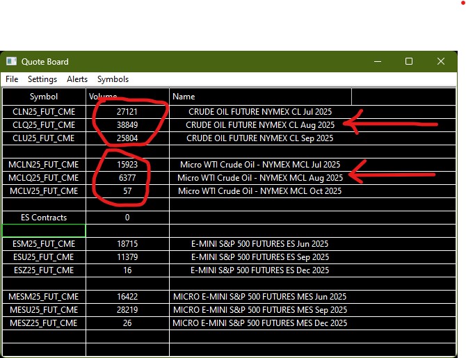 The main CL NYMEX contract, in this case and according to the accompanying image is due a rollover to CLQ25. I chart using the CL contract, and I execute using the Micro CL Contract. The micro contract is not due a rollover. Is there a way to have the notice occur based on the "Trade and Current Quote Symbol (Action)" Rolling over based on the larger contract results in terrible fills on the micro contract. I suppose I could just disable the "Detect Rollover...." setting, but it is awfully convenient to have, and one less thing to think about. https://www.sierrachart.com/Download.php?Folder=SupportBoard&download=122298 |