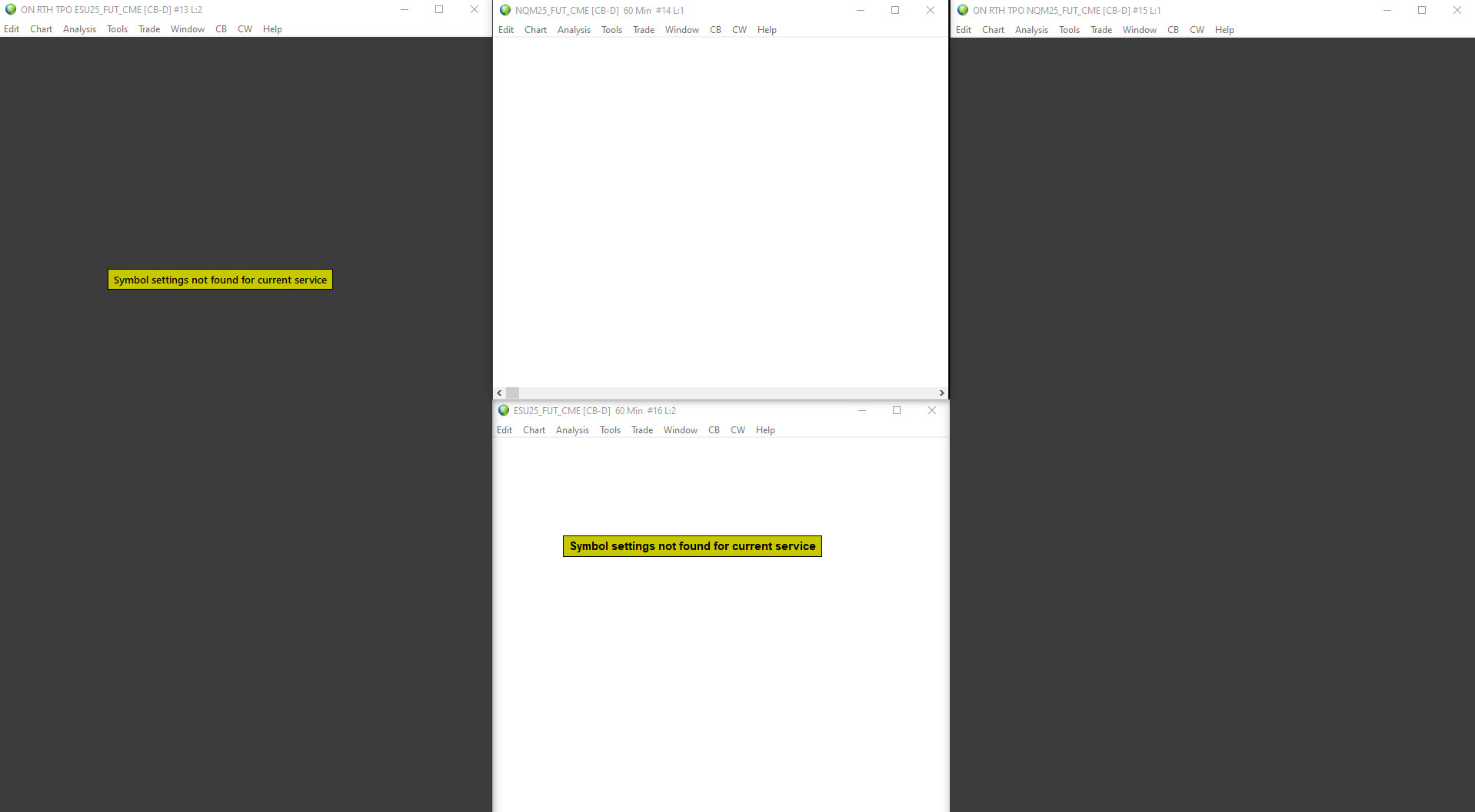 Hello Support, As of market open open last night my sub-instance 2 and sub-instance 3 not getting any live data updates. Meanwhile main instance is working correctly and if I transfer the chart book from any of the sub-instances to the main instance it opens up and loads live data without any issues. I have deleted both instances and recreated them but the problem still remains. However, now I am getting a message "SYMBOL SETTINGS NOT FOUND FOR CURRENT SERVICE" (image attached) in every chart on any chartbook on both sub-instances. The connection on both sub-instances showing live data, the control panel is green. No configuration changes were made to any chartbooks or sub-instances since last week. Please advise. Date Time Of Last Edit: 2025-06-16 14:18:27