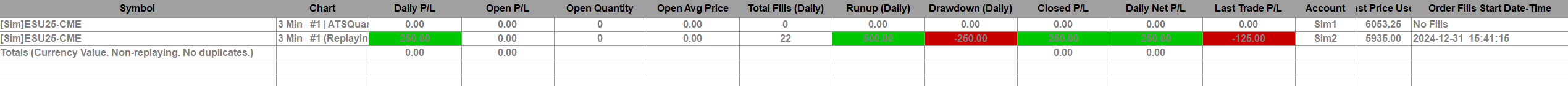 Orders were being generated prior to beginning the backtest (i.e. when the chart was reloading) based on the current day. For example, if today is Friday and I want to backtest from Monday to Friday, an order would be generated on Friday EOD while the chart was loading. This would create an open position when the backtest began and would thus distort the TAL. The solution is to clear the sim accounts and monitor the queue in the displaying settings before beginning the backtest. |