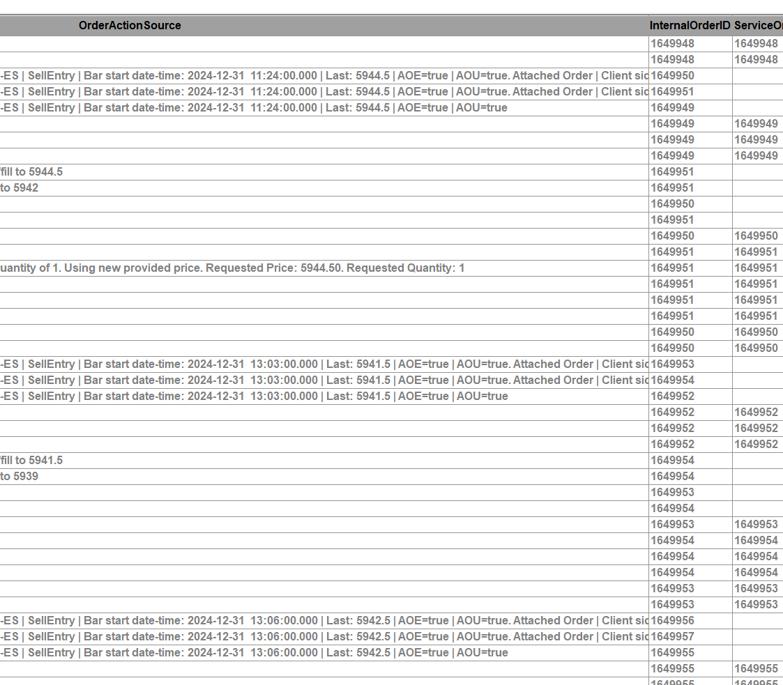 The TAL is creating orders that never occurred. I've attached screenshots of the TradesList and OrderActionSource. Viewing the OrderActionSource, you can see that the system was selling throughout the period (i.e. 2024-12-31); The PnL matches that of the ChartStats. However, viewing the TradesList, every trade is Long. There were no long trades. Also, the backtest started on 2024-12-31 but here are trades on the current date of which is not part of the backtest. Looking at the TradesList, you can see that even though there were no trades on 6-20, TAL lists an entry as of the current date with an exit as of the beginning of the backtest (i.e. 2024-12-31) Date Time Of Last Edit: 2025-06-20 15:01:55